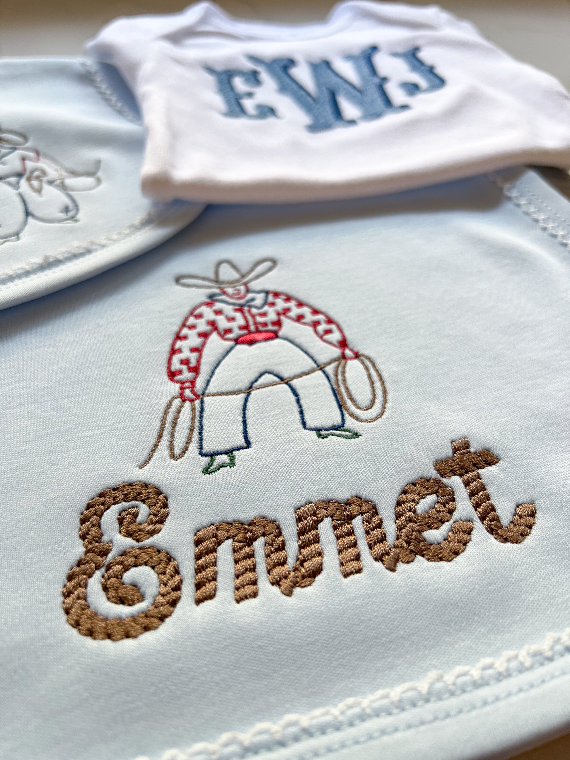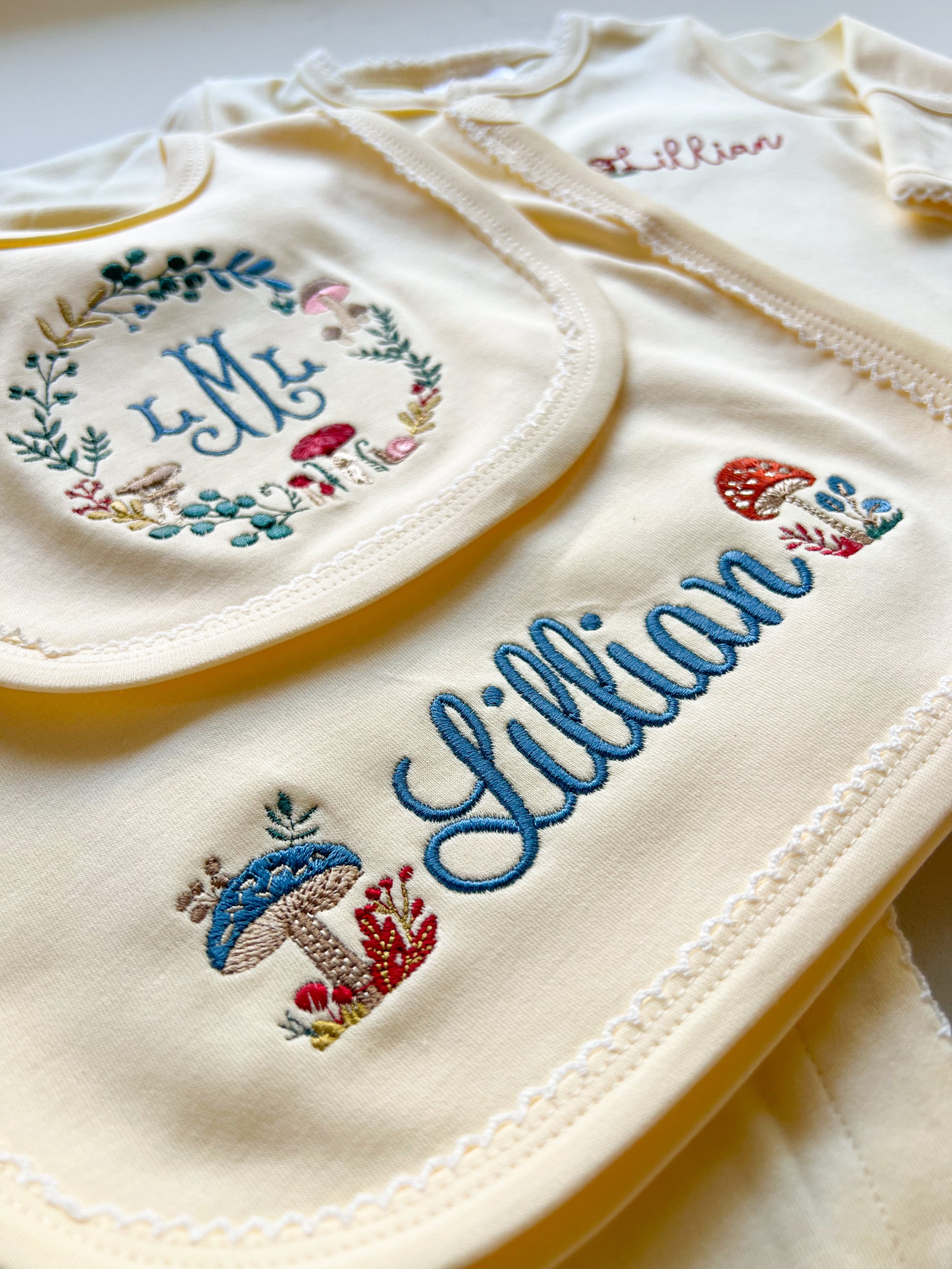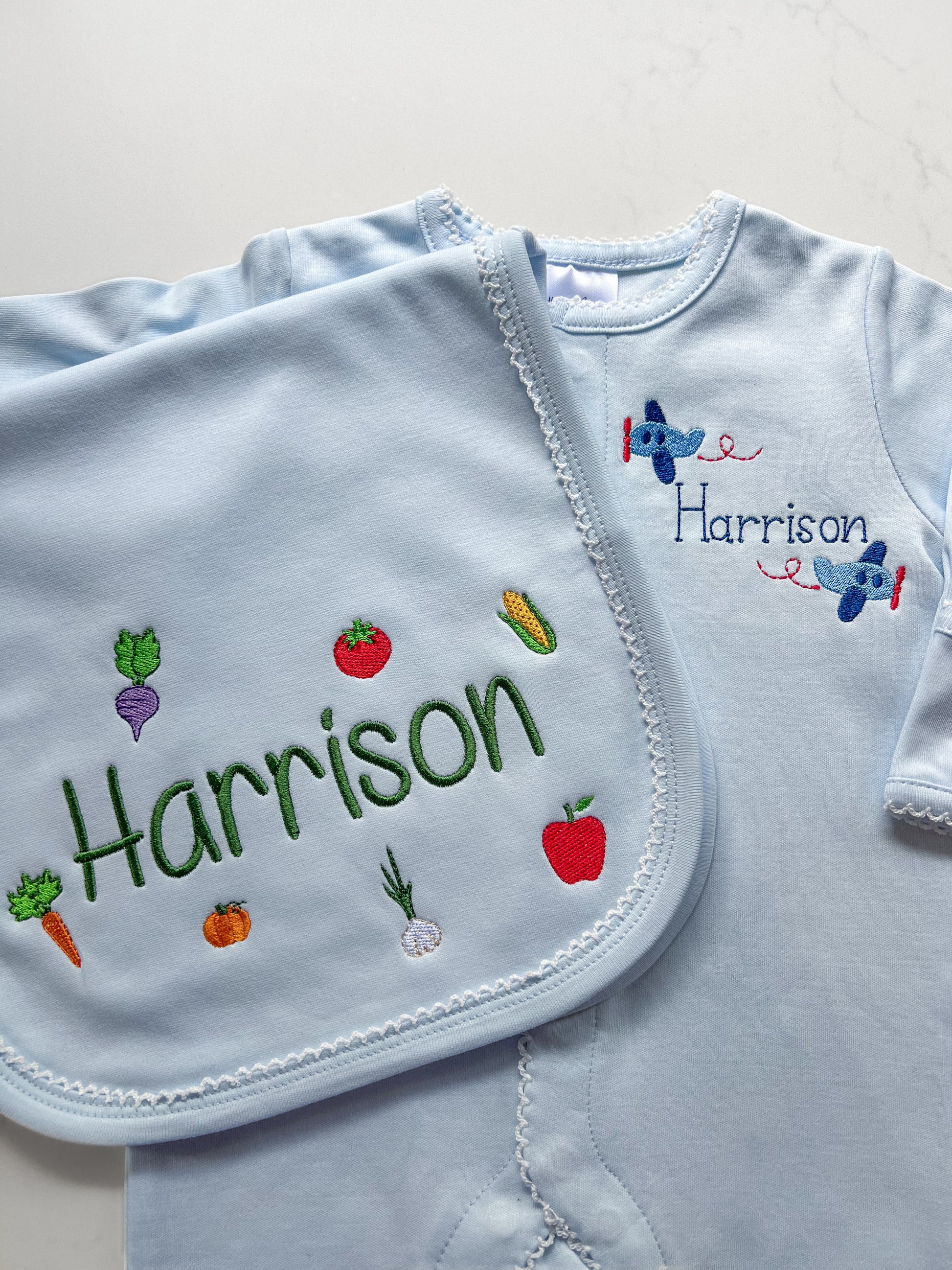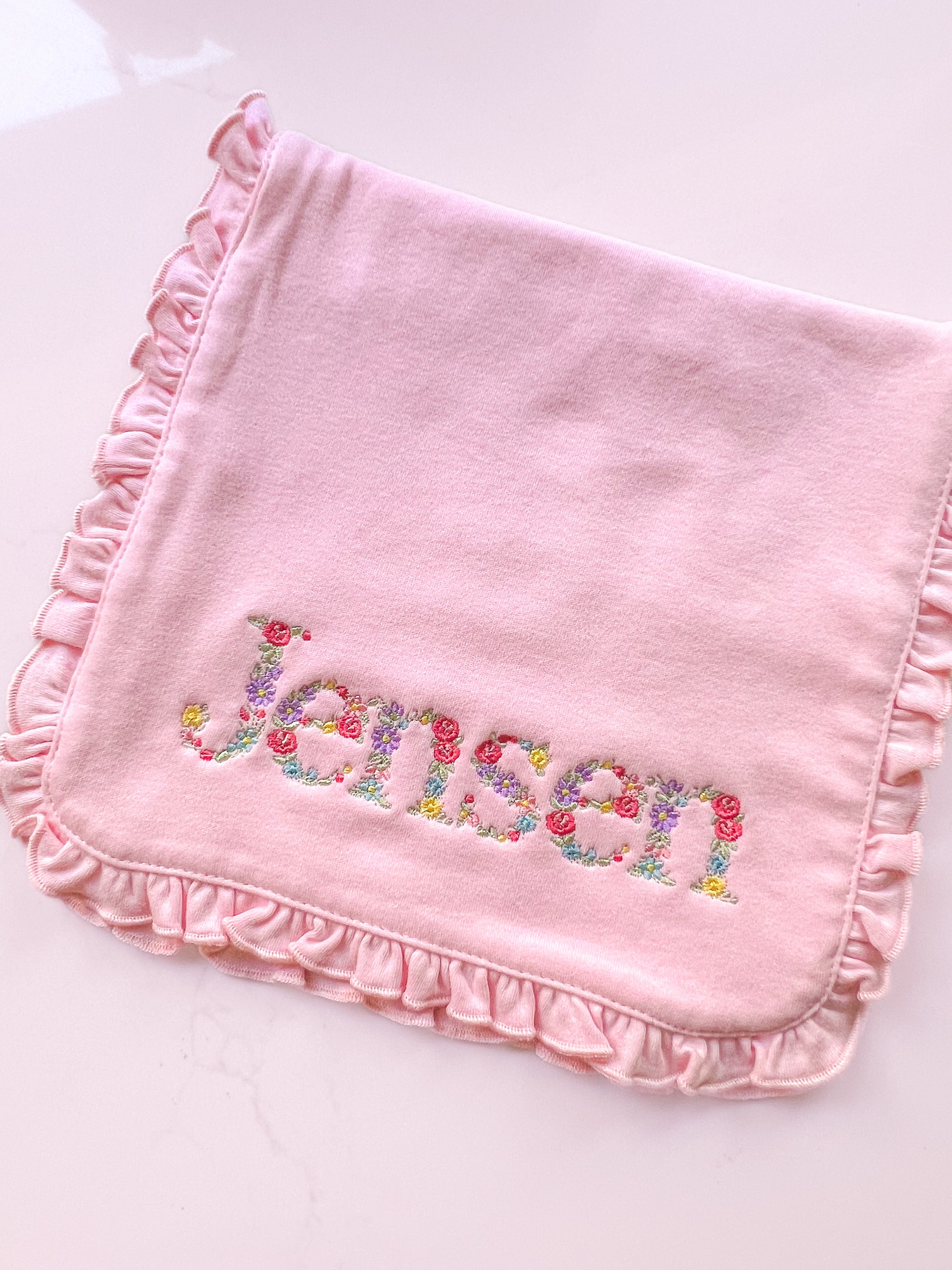 During checkout, provide details below including name, monogram, themes (florals, dinosaurs, etc), color preferences, likes and dislikes. If left blank, designs will be stitchers choice!