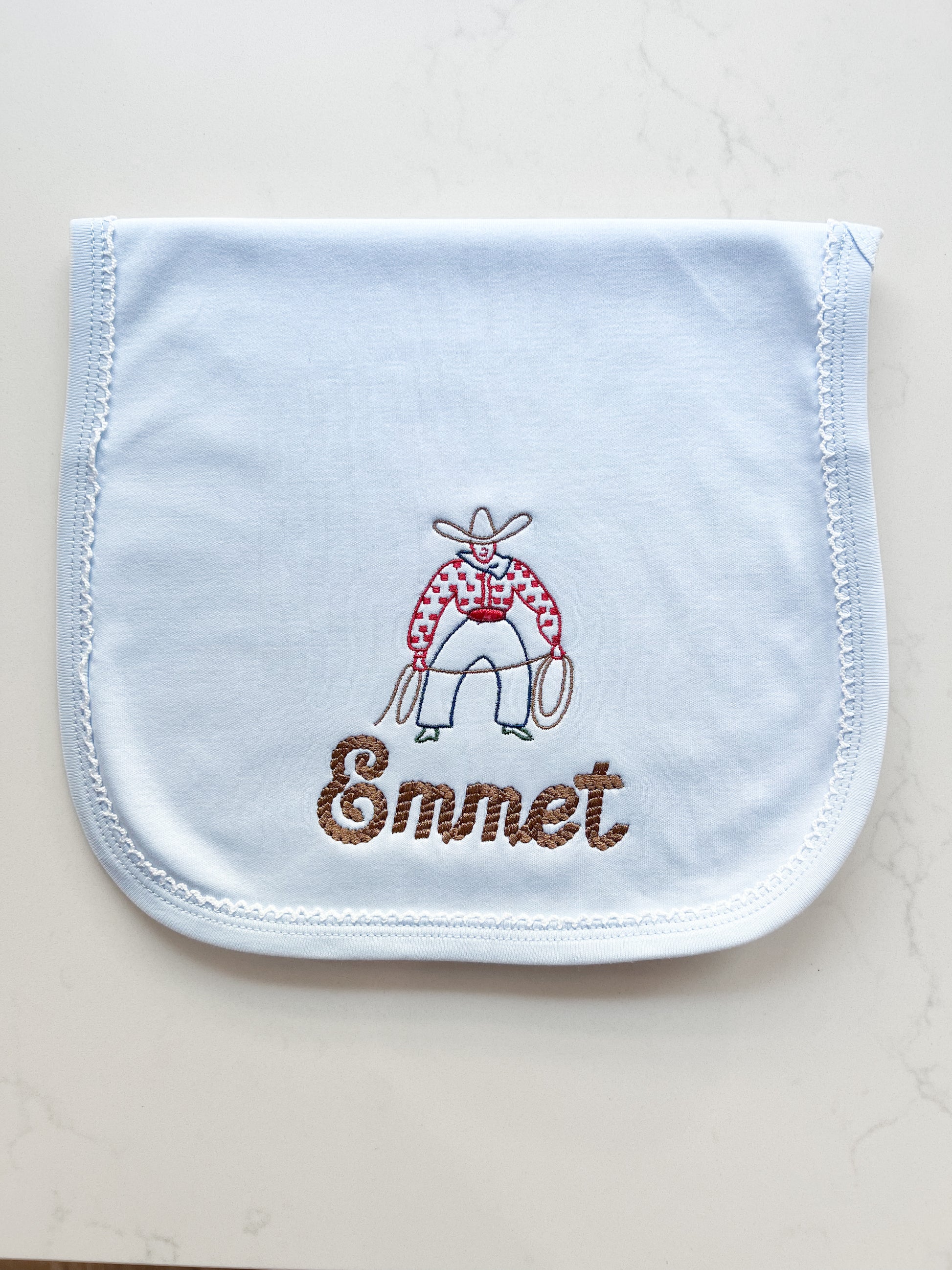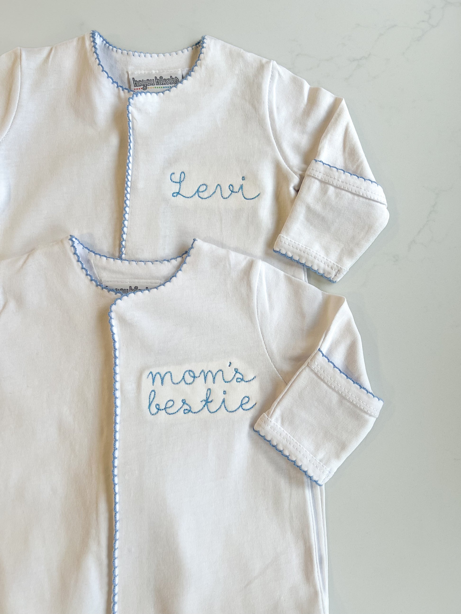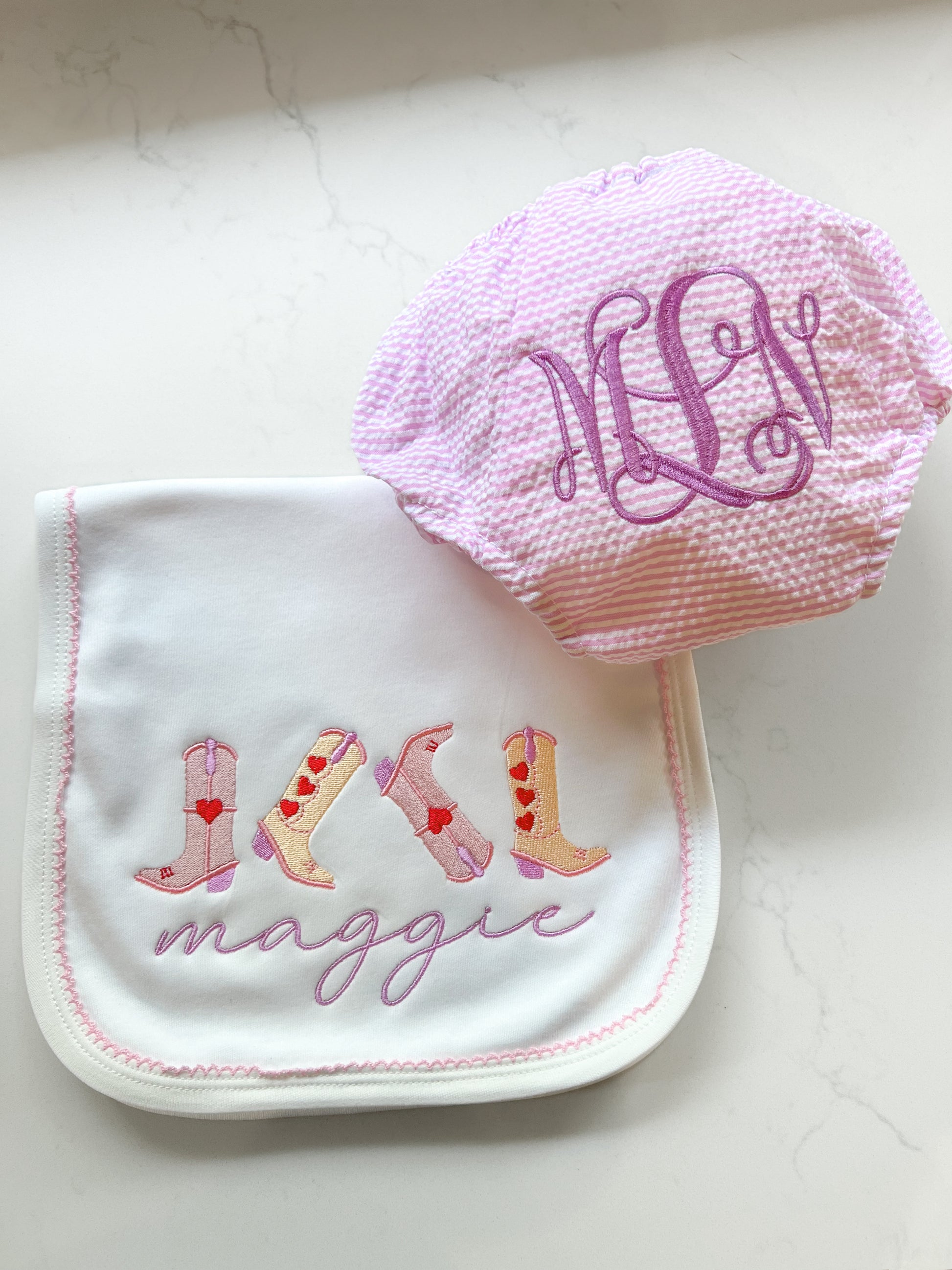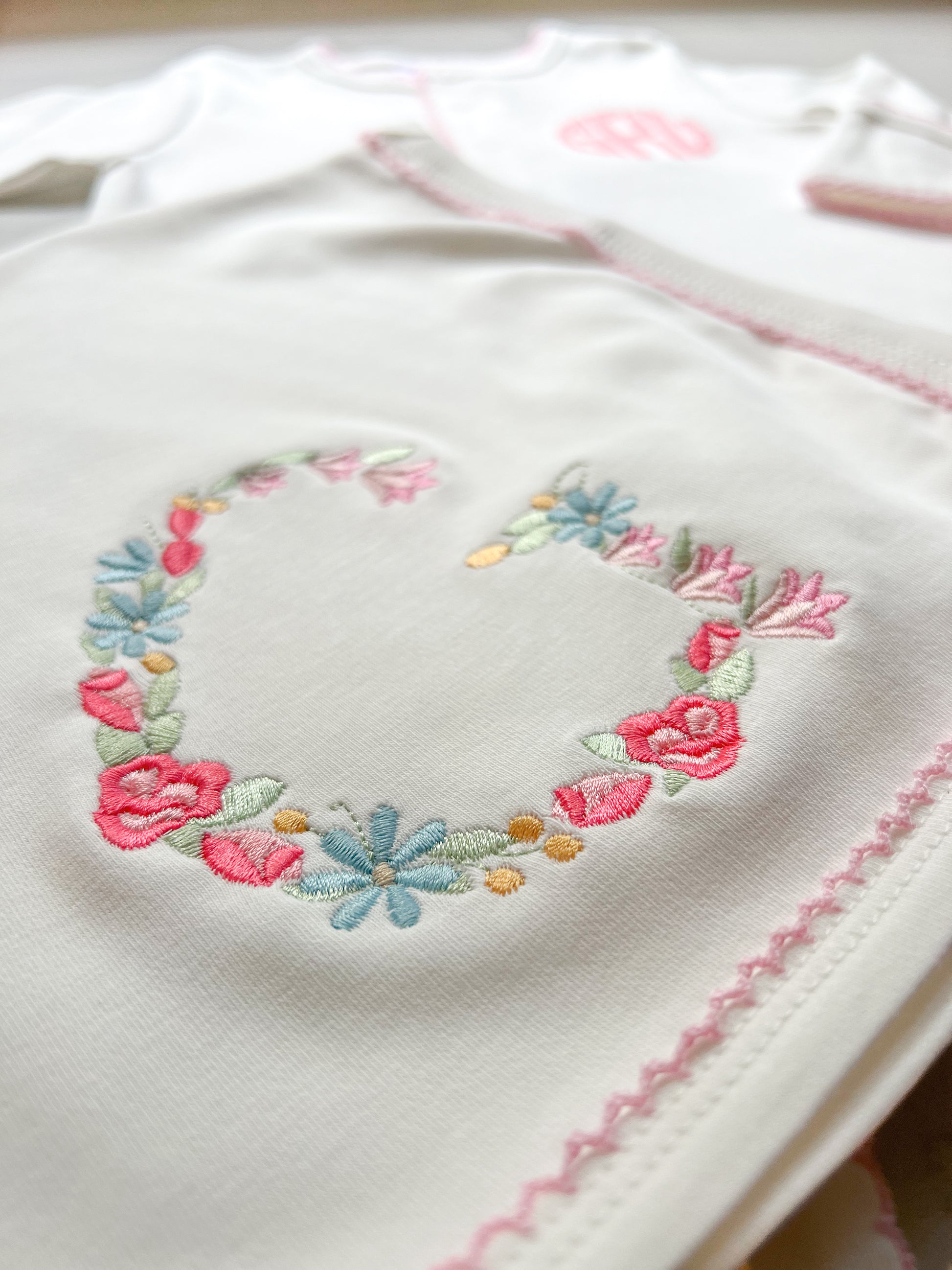During checkout, provide details below including name, monogram, themes (florals, dinosaurs, etc), color preferences, likes and dislikes. If left blank, designs will be stitchers choice!