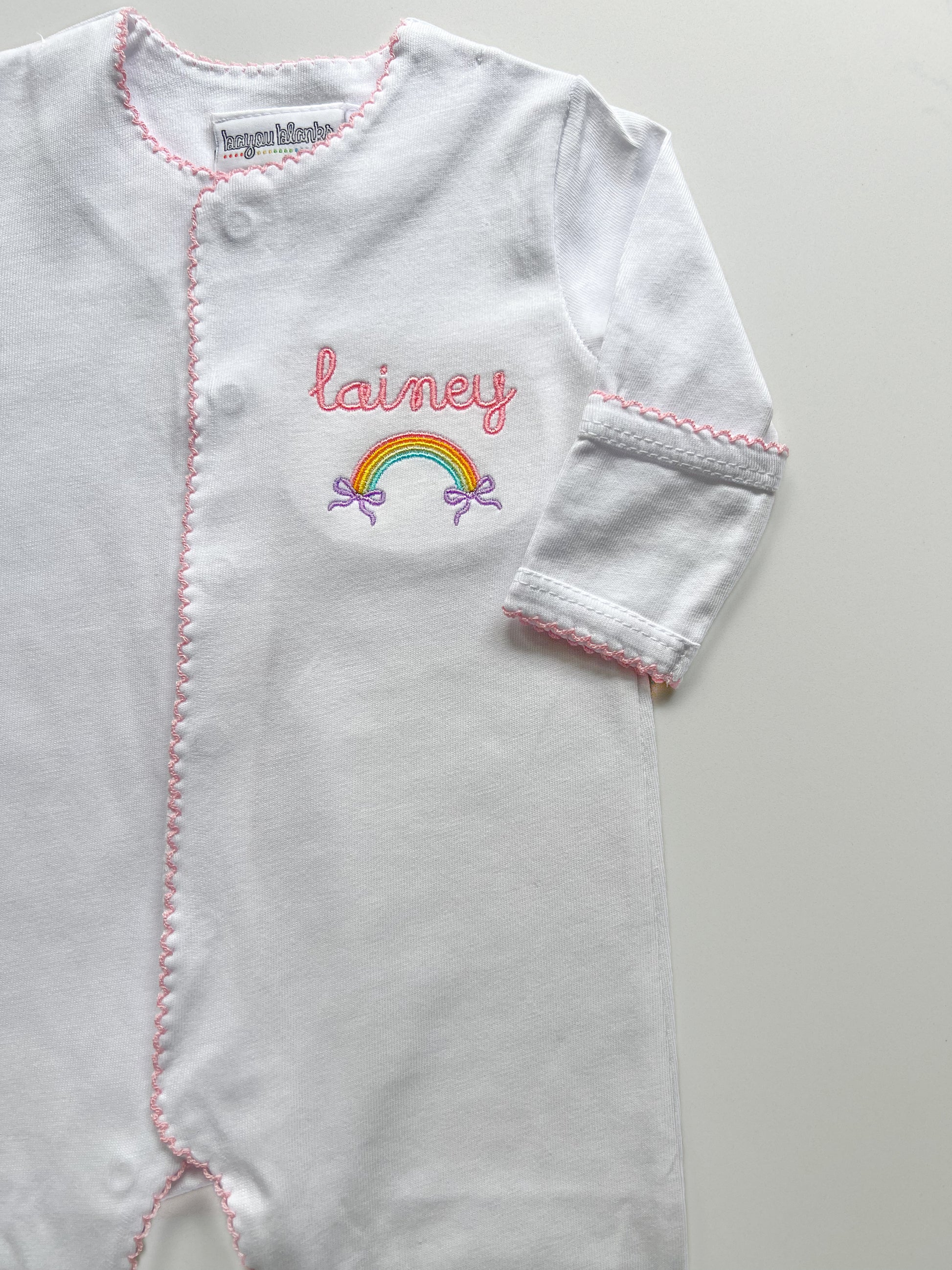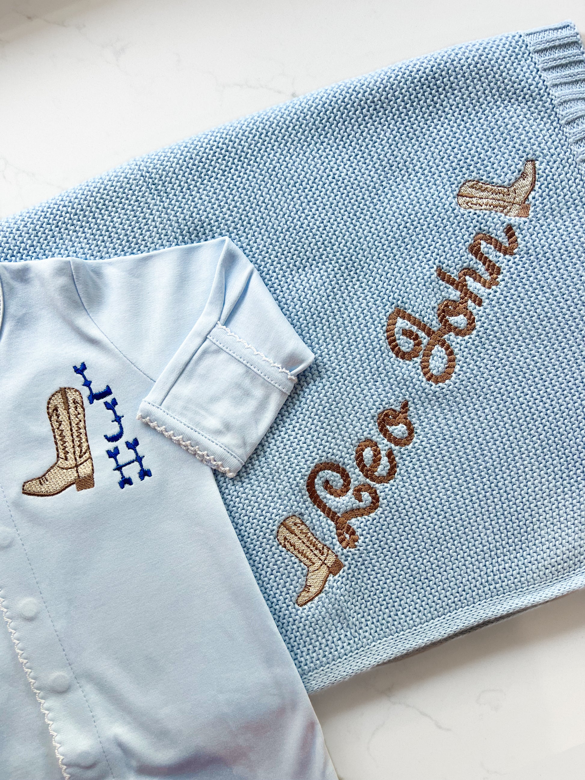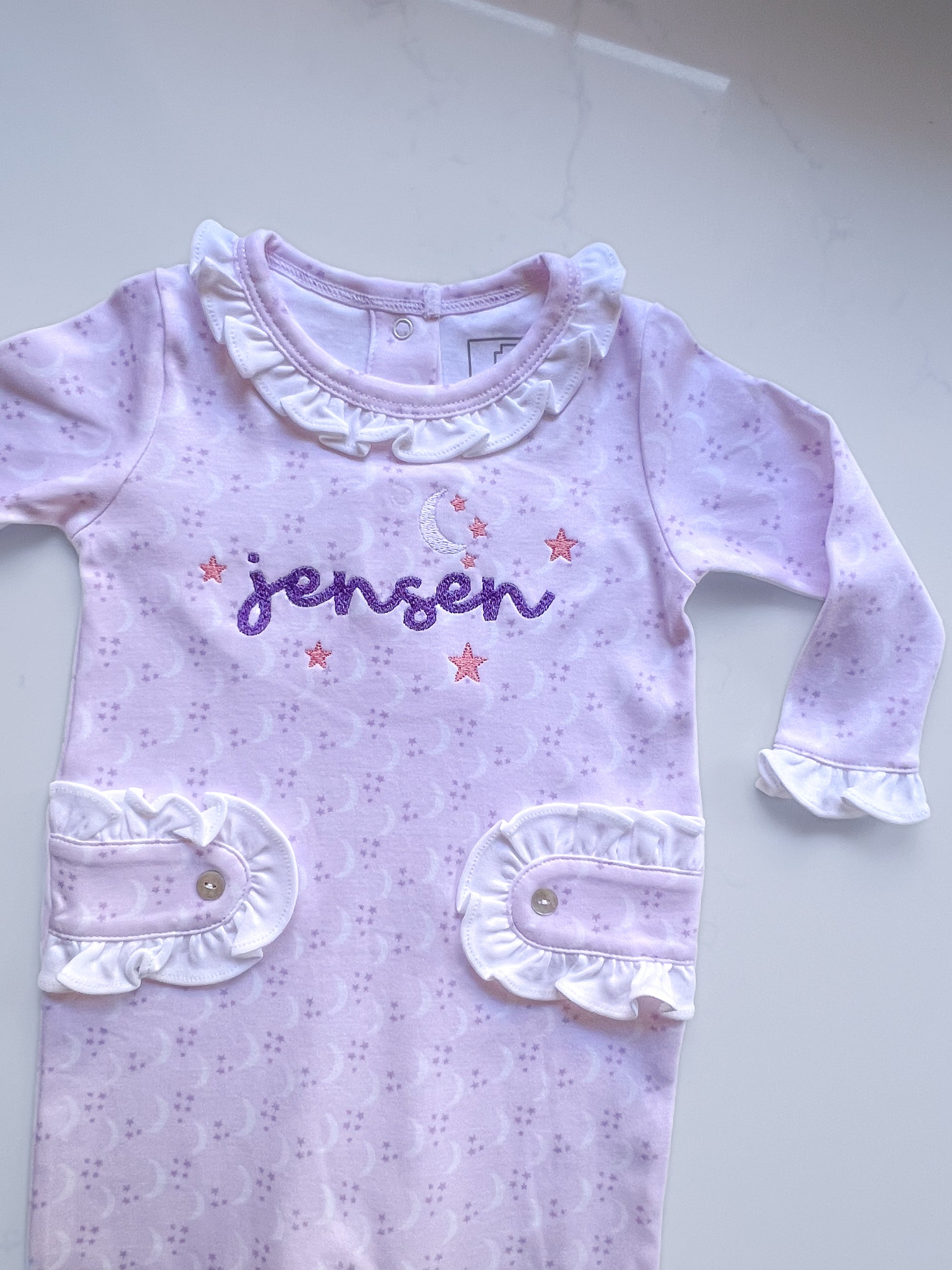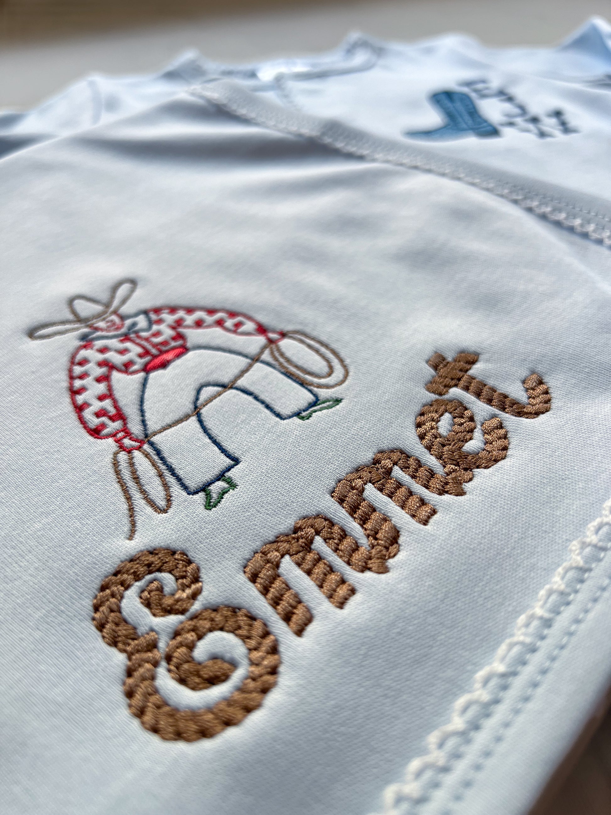 During checkout, provide details below including name, monogram, themes (florals, dinosaurs, etc), color preferences, likes and dislikes. If left blank, designs will be stitchers choice!