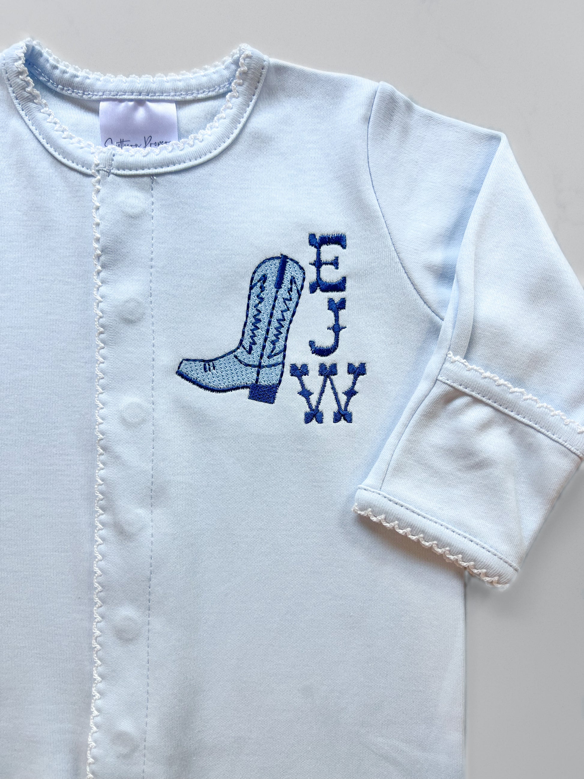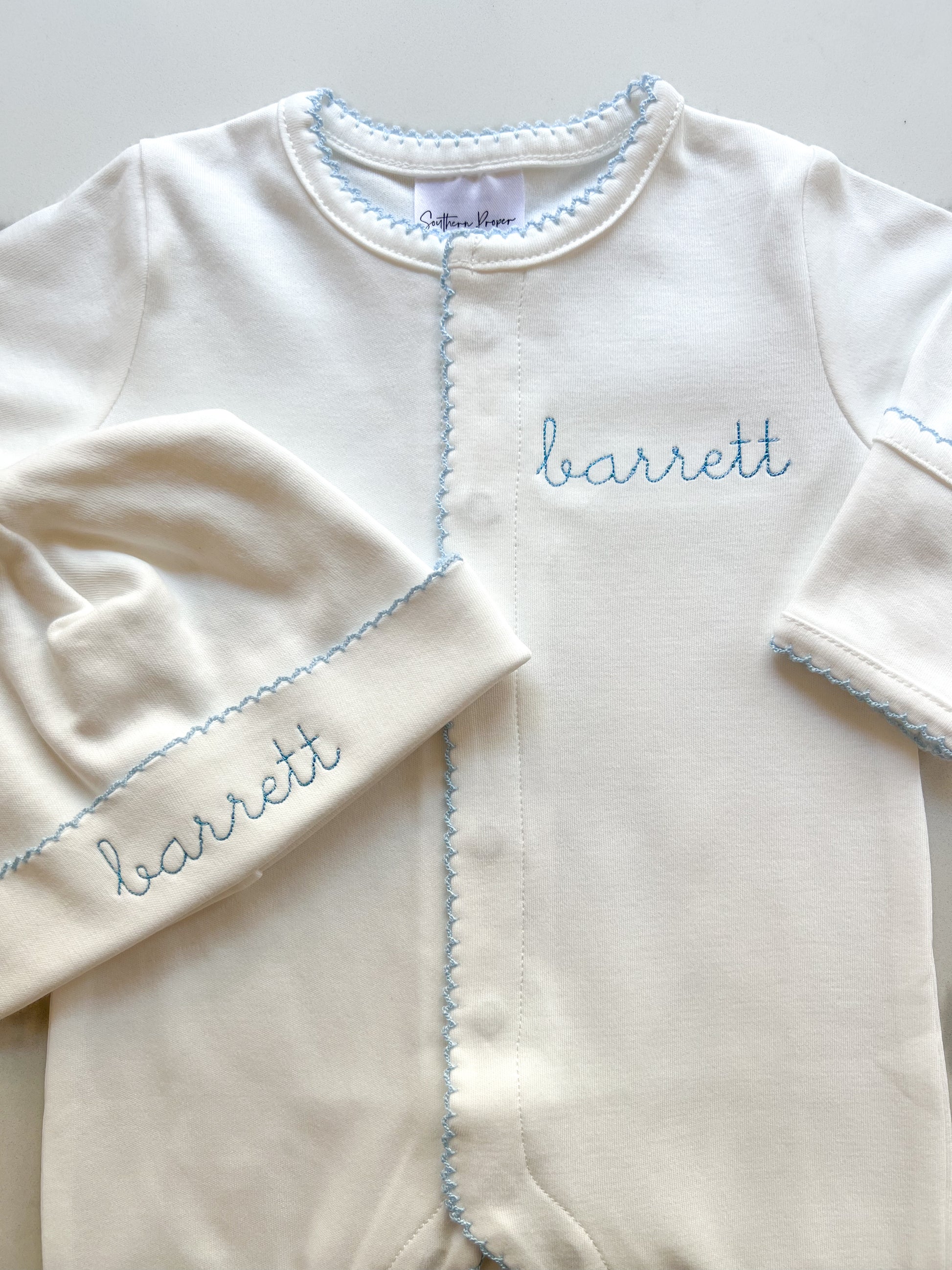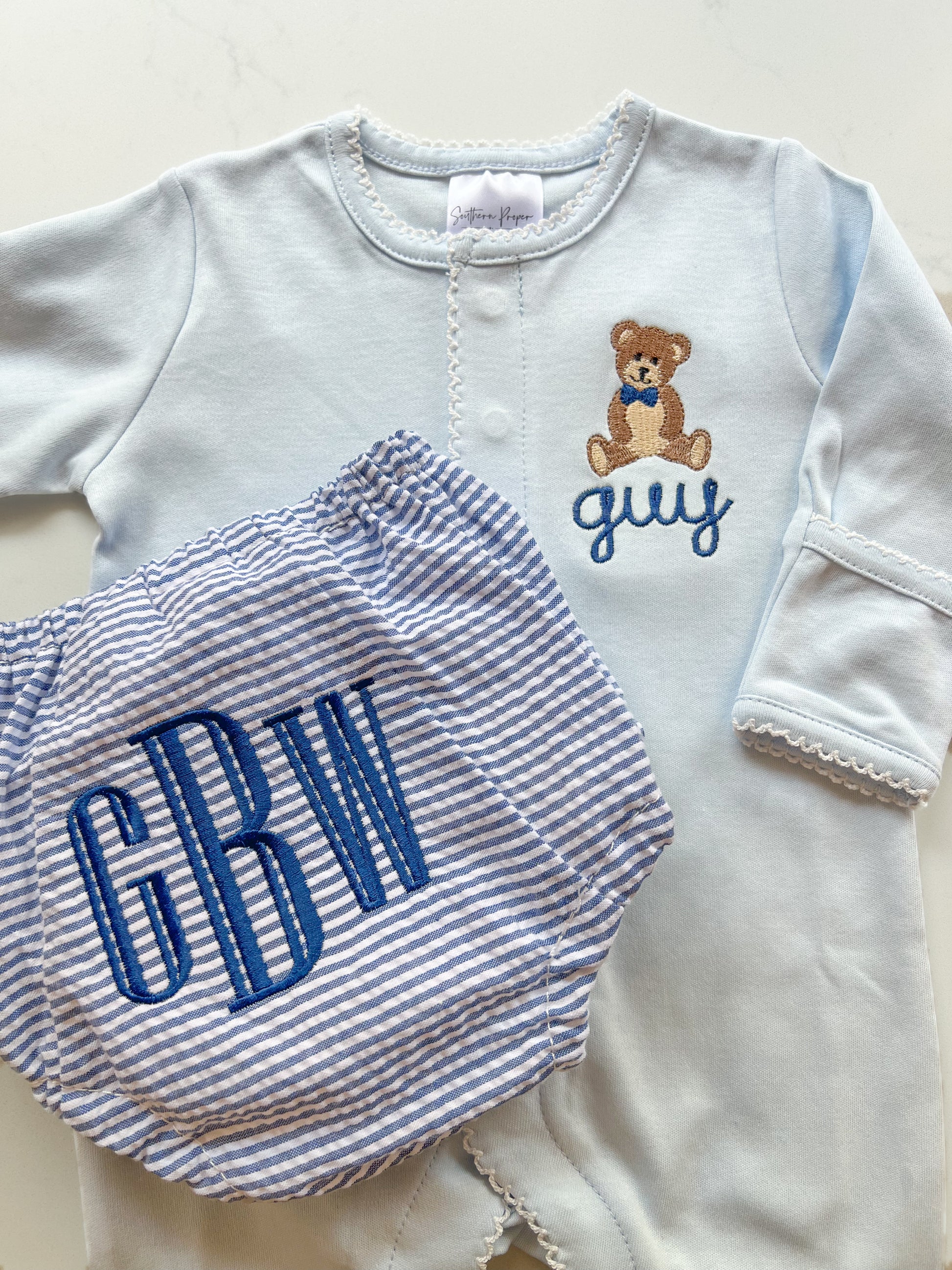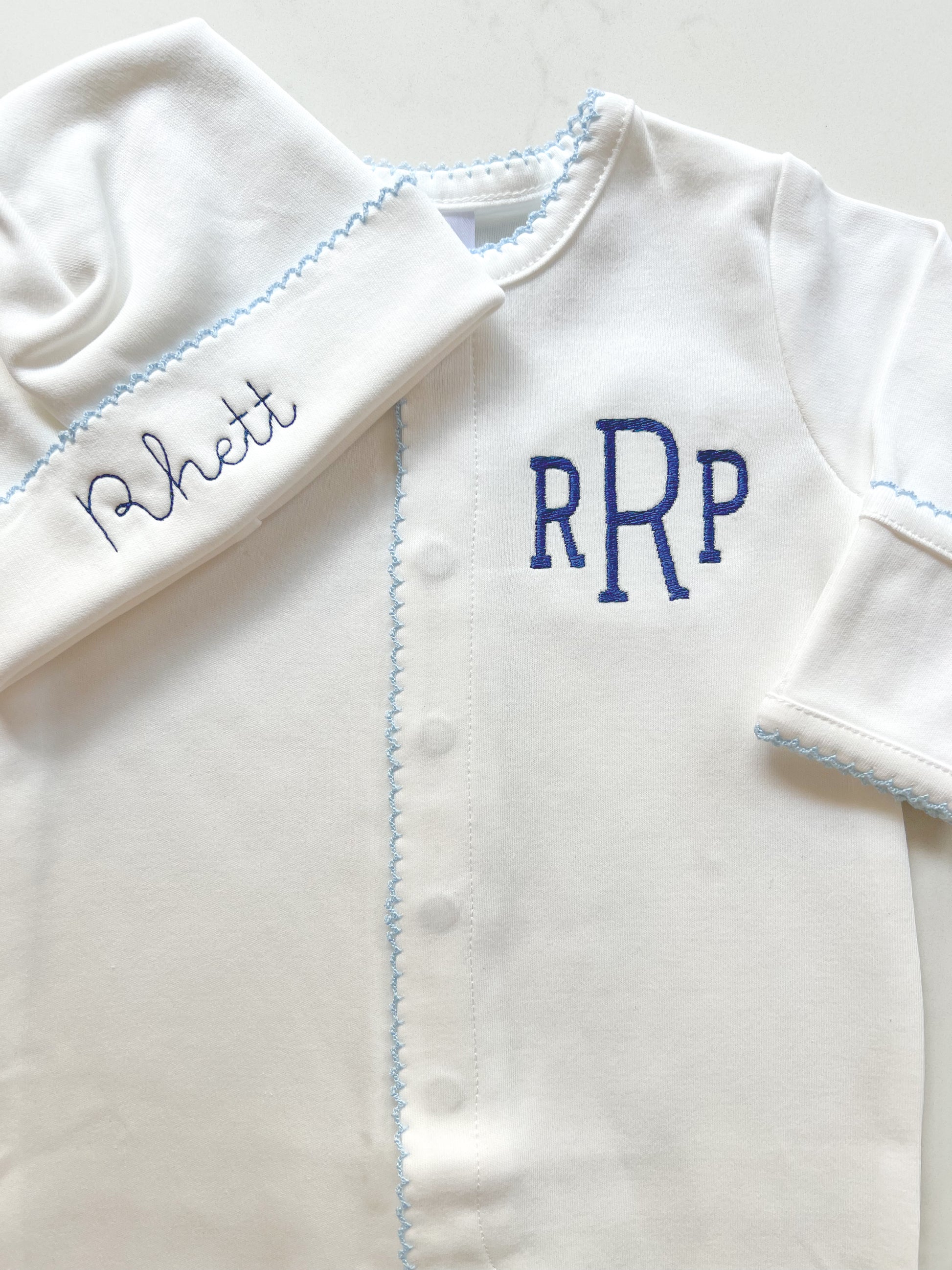 During checkout, provide details below including name, monogram, themes (florals, dinosaurs, etc), color preferences, likes and dislikes. If left blank, designs will be stitchers choice!