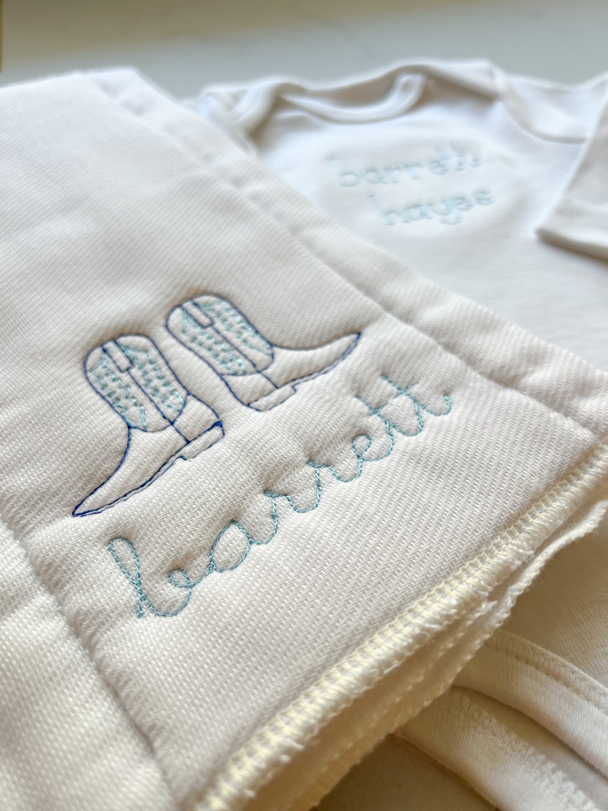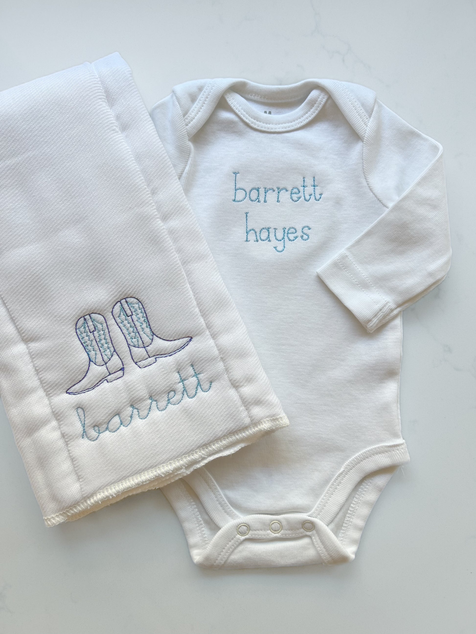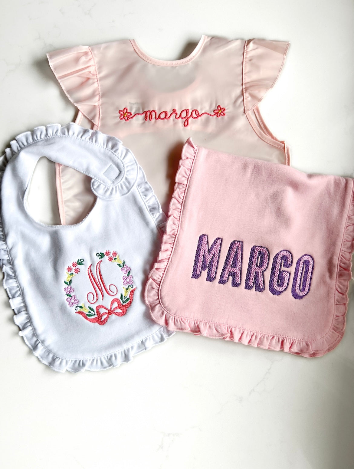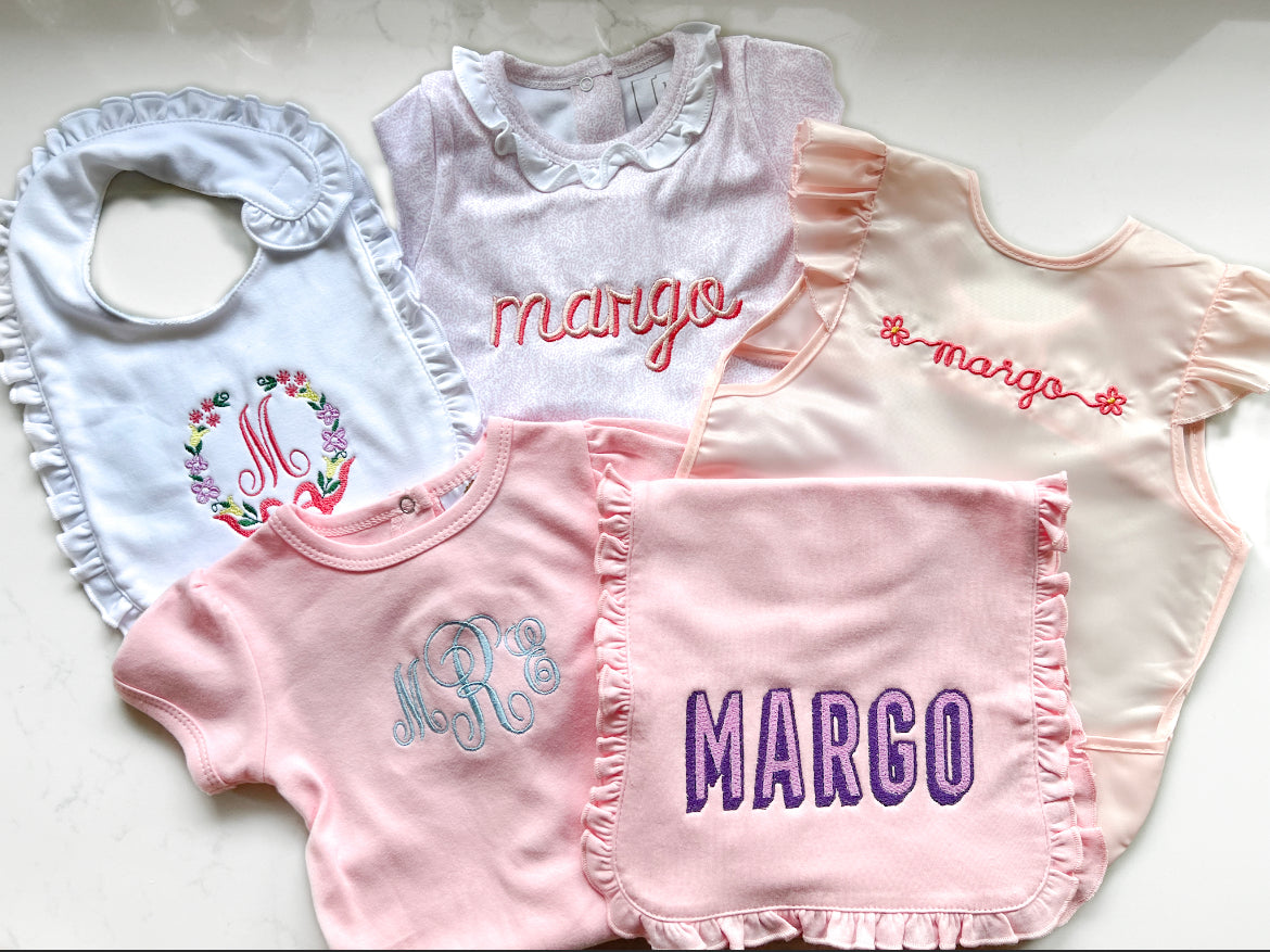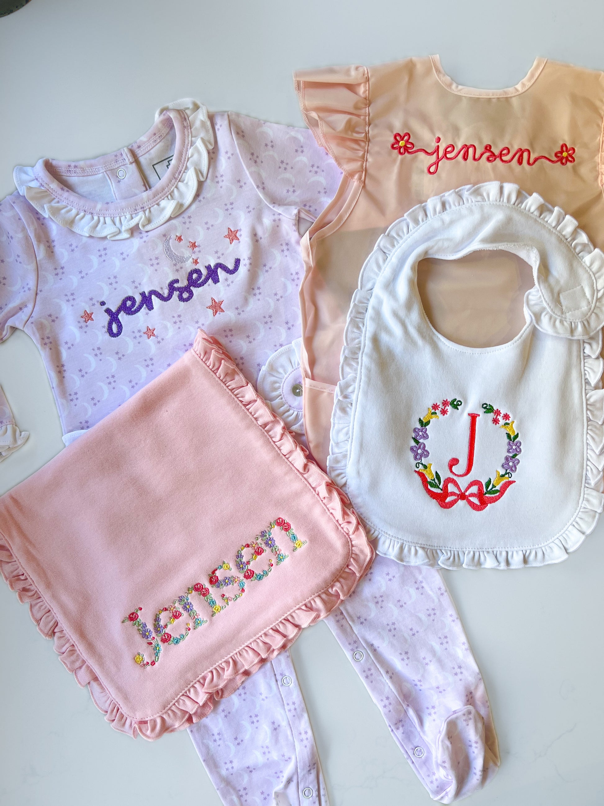 Shower the bundle of joy with a custom baby bundle package. Choose your package and we will pick your items and customize for you. Items include but not limited to bibs, onesies, layettes, burp cloth, and many others.