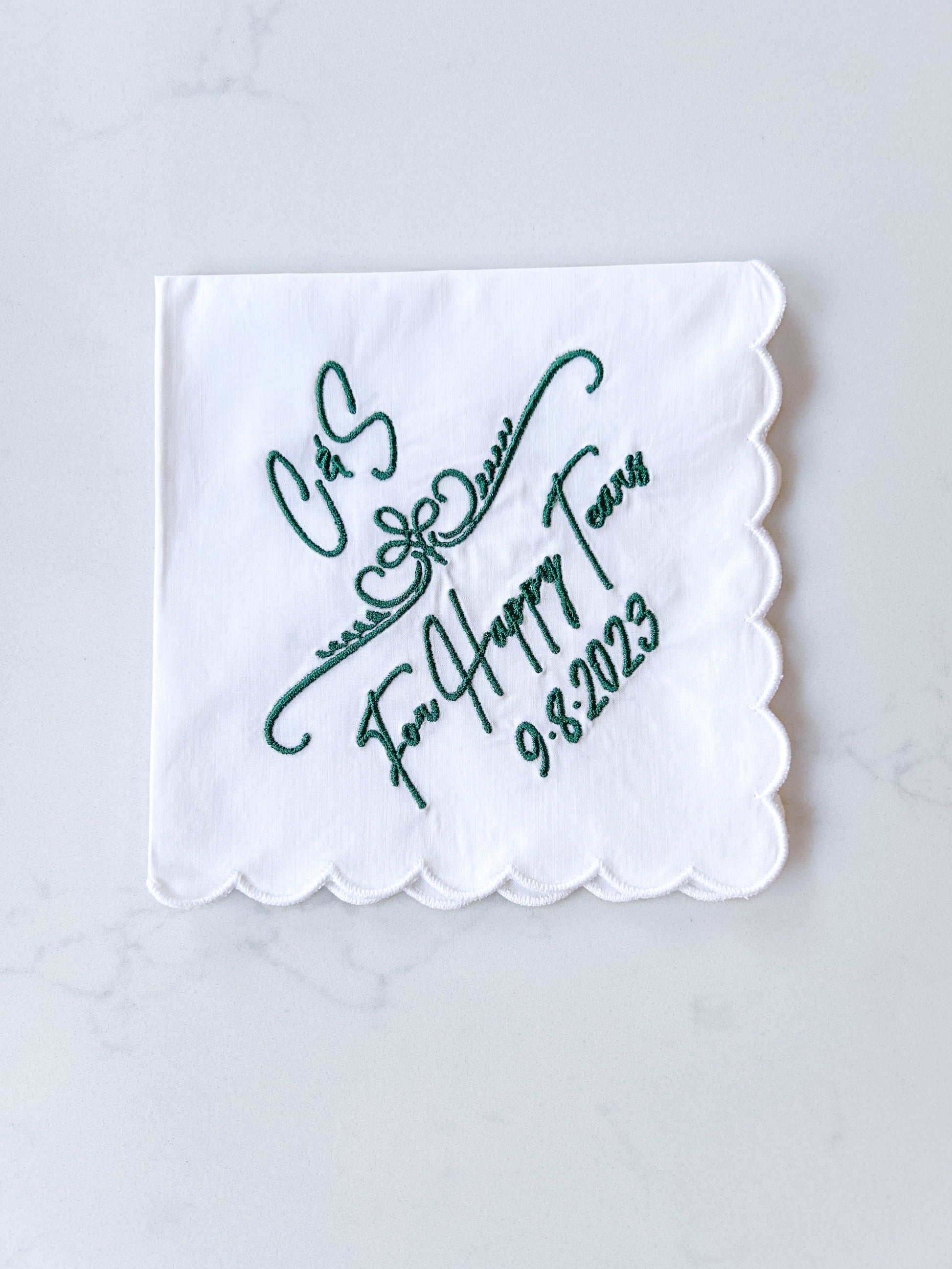 Let’s collaborate to create a custom hanky celebrating the big day. Add a personal touch to the big day with custom hankies that can be created for any guest including parents of the bride and groom, wedding party, and wedding guests.
