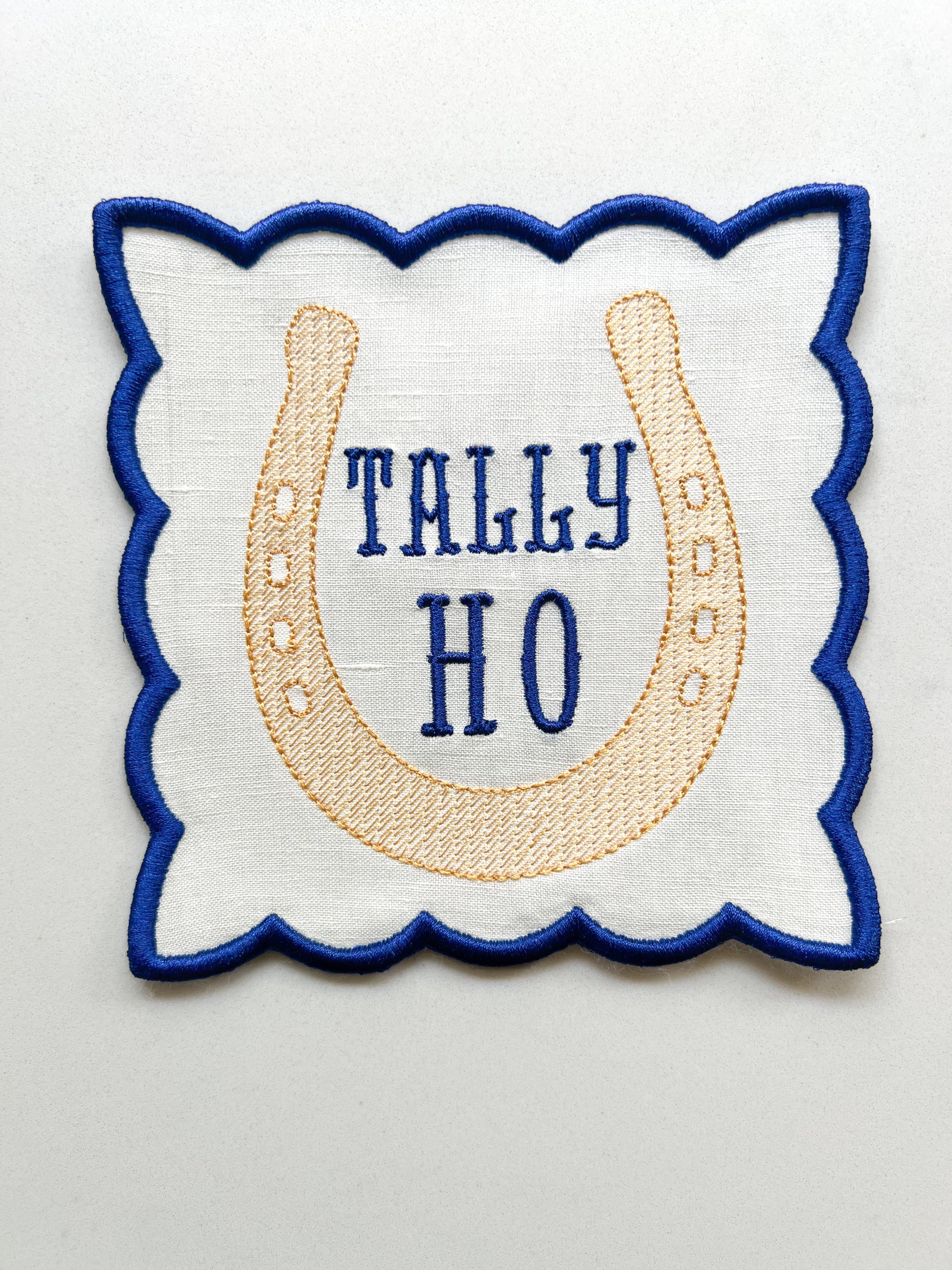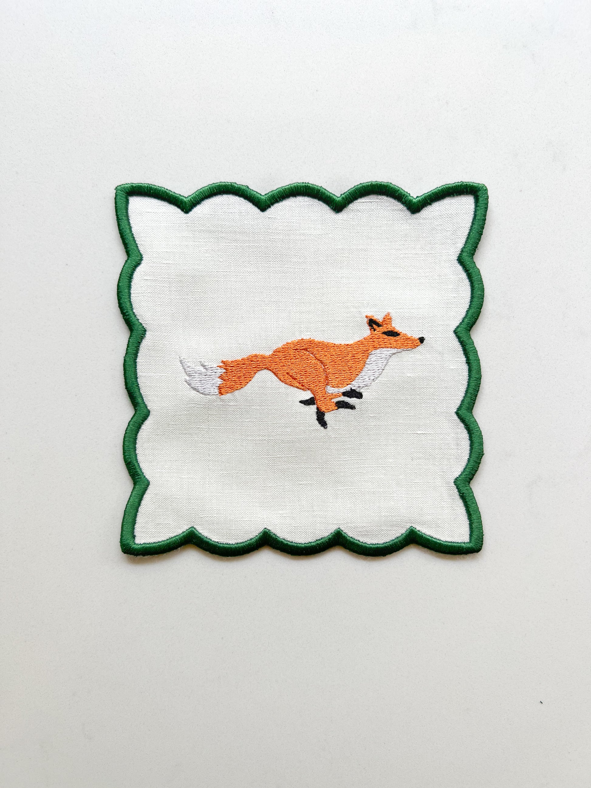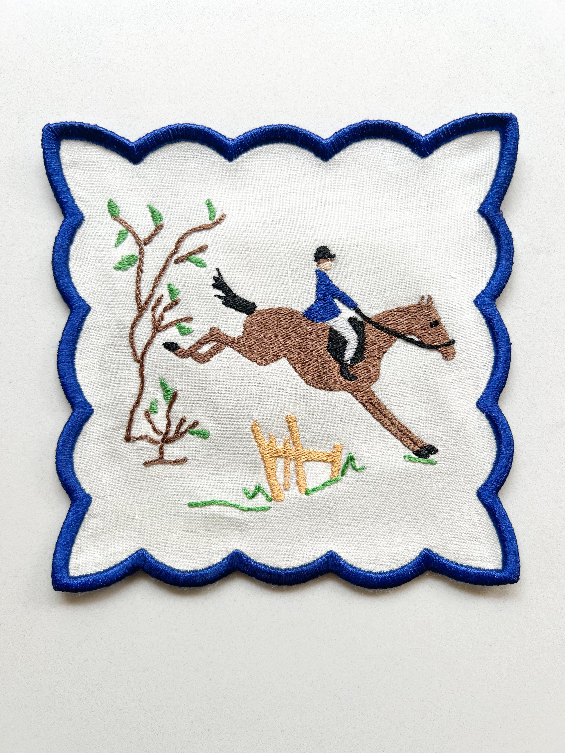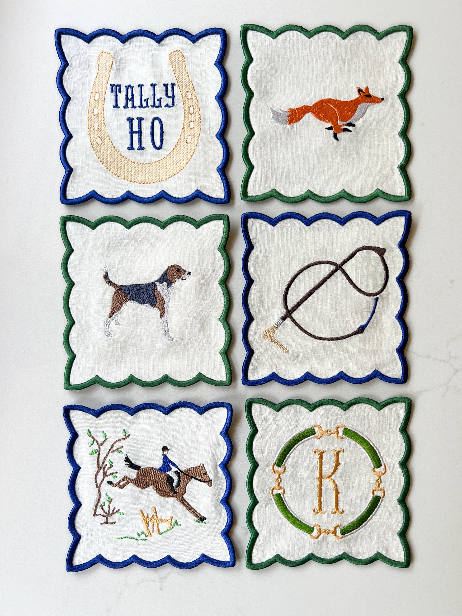 Beautiful linen curated into Fox Hunting cocktail napkins. Set of 6 which includes monogram horse bit, crop, hound, fox, horse jumping, and “Tally Ho.”