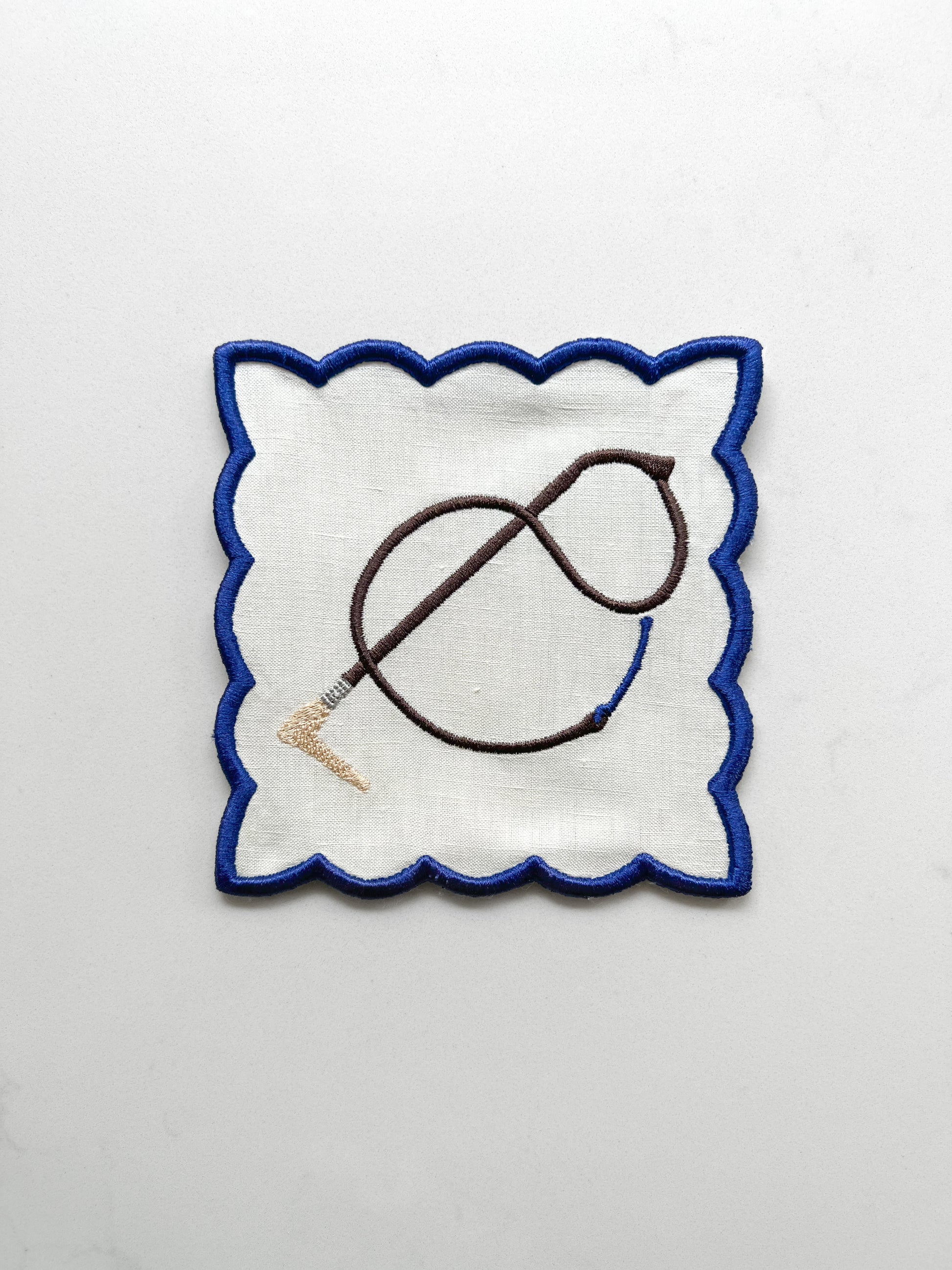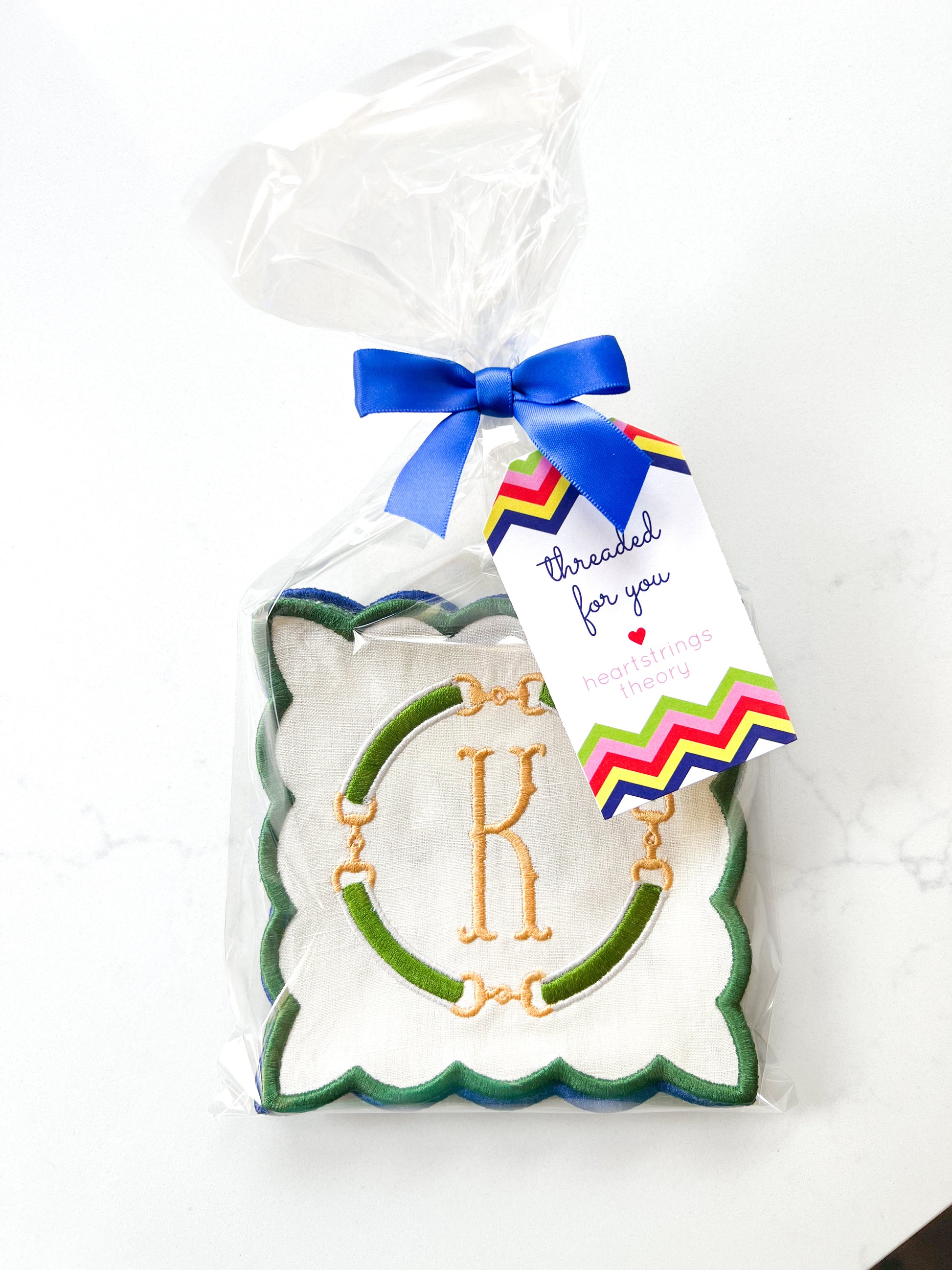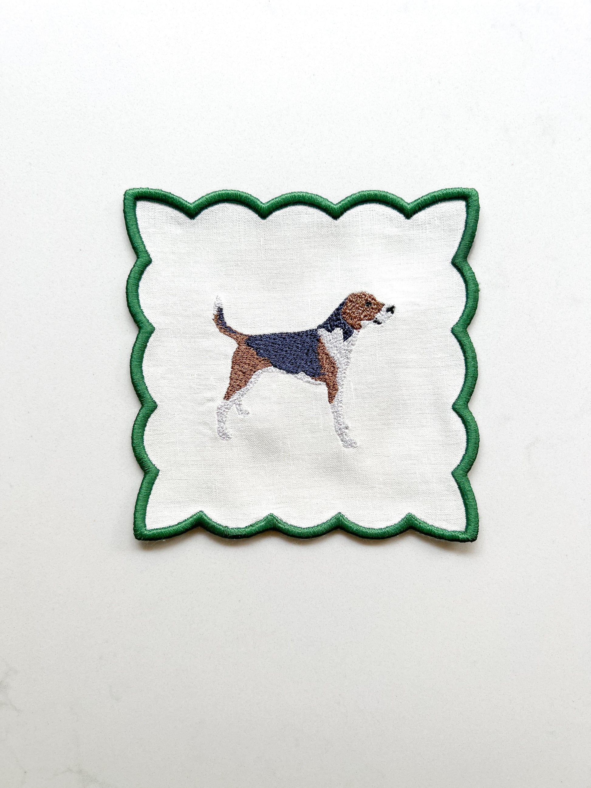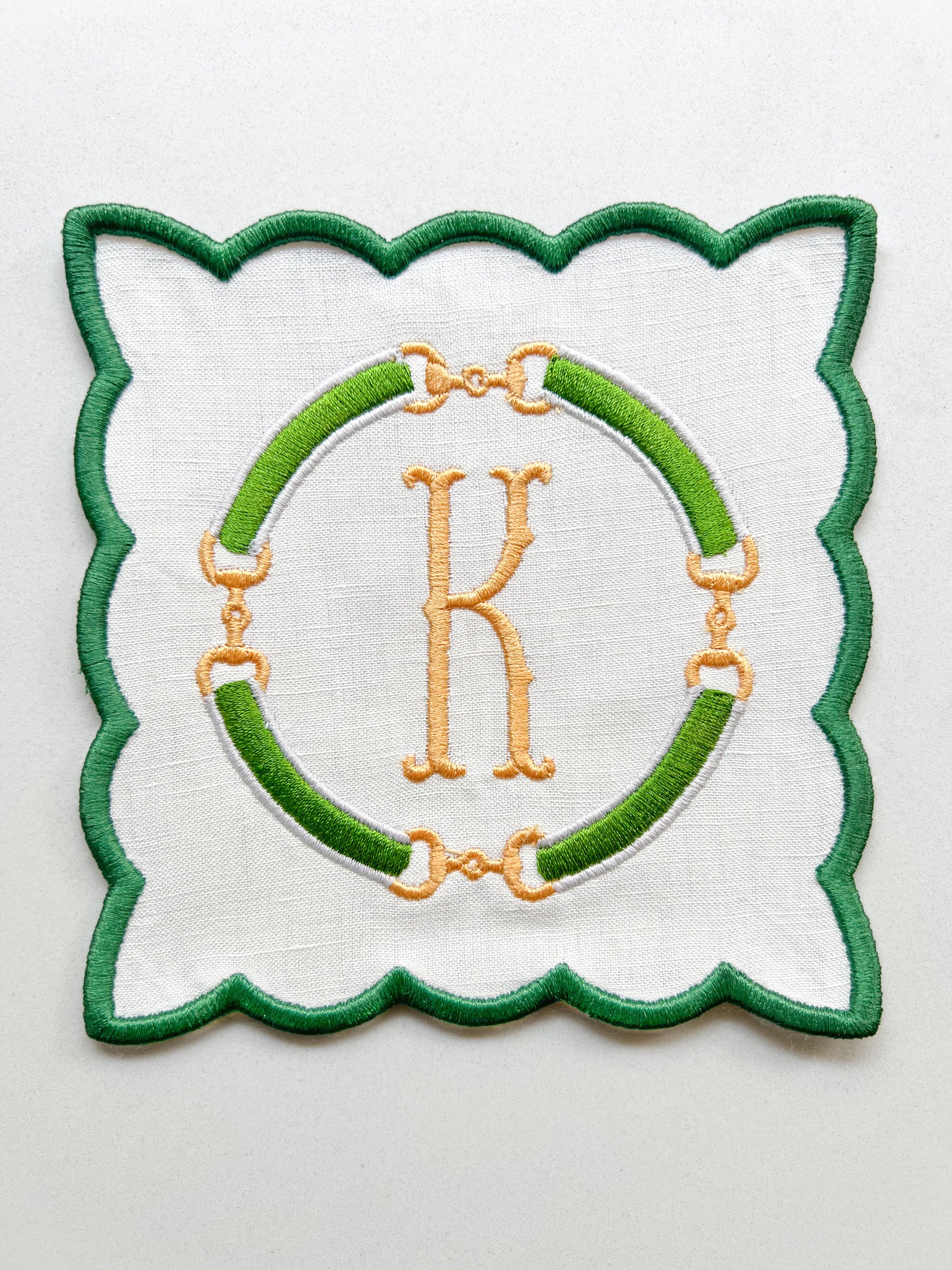 Beautiful linen curated into Fox Hunting cocktail napkins. Set of 6 which includes monogram horse bit, crop, hound, fox, horse jumping, and “Tally Ho.”