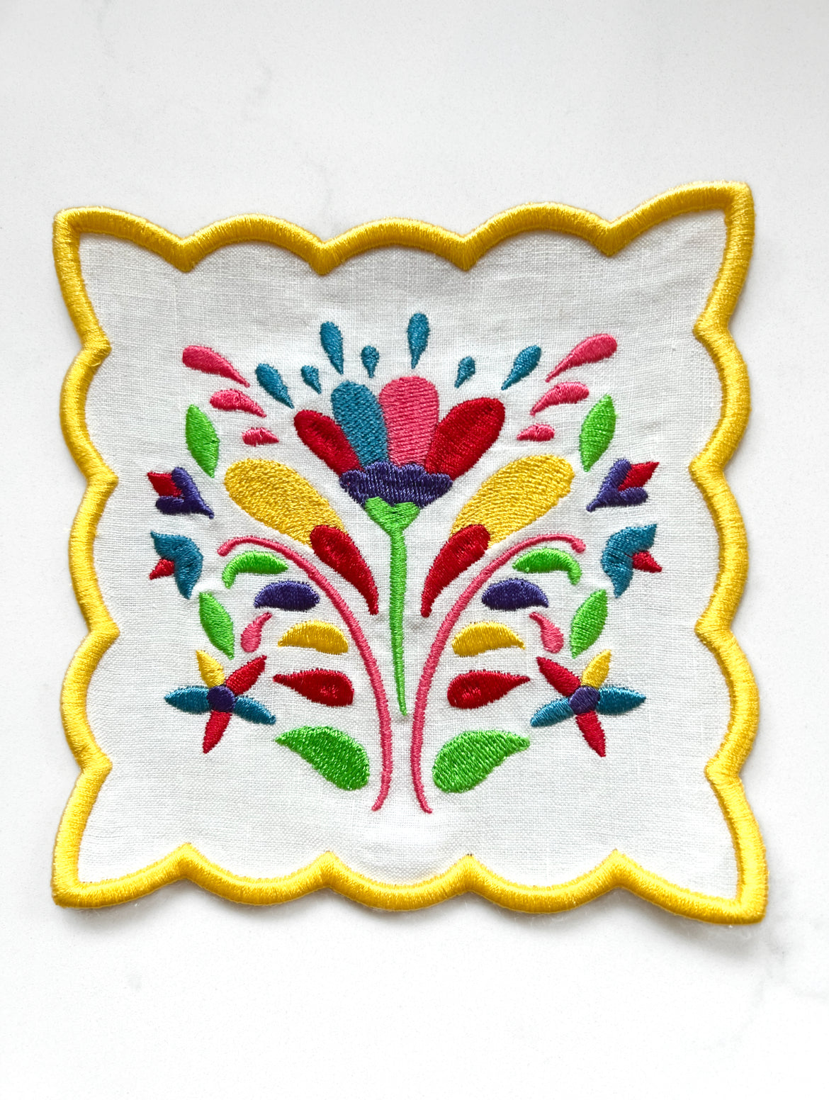 Offered on a classic hemstitch or scallop edge. Hemstitch napkins are luxury brand SFERRA which are 100% linen and measure 6x6". Scalloped edges are a linen/silk/cotton blend and measure 5x5.”