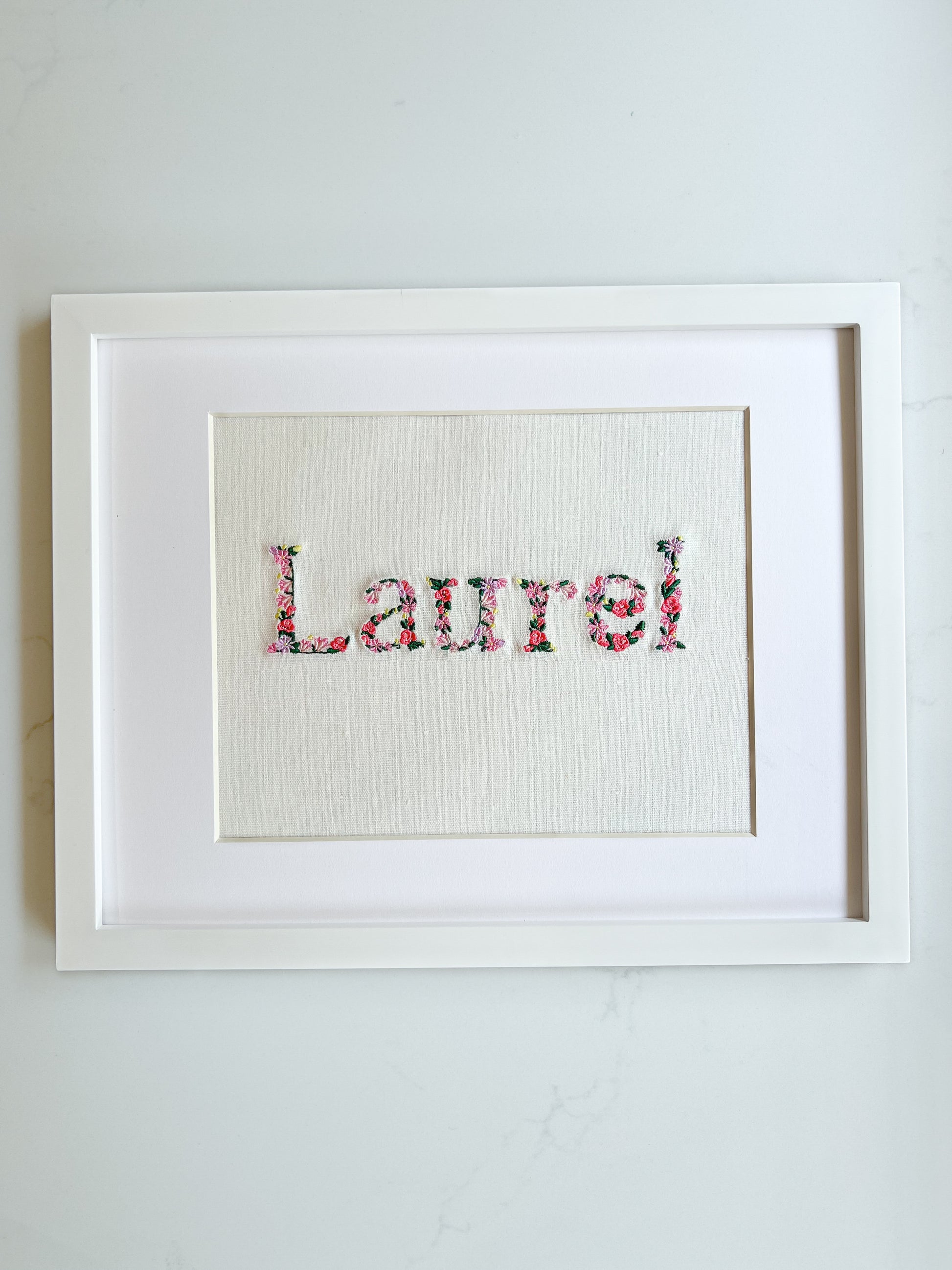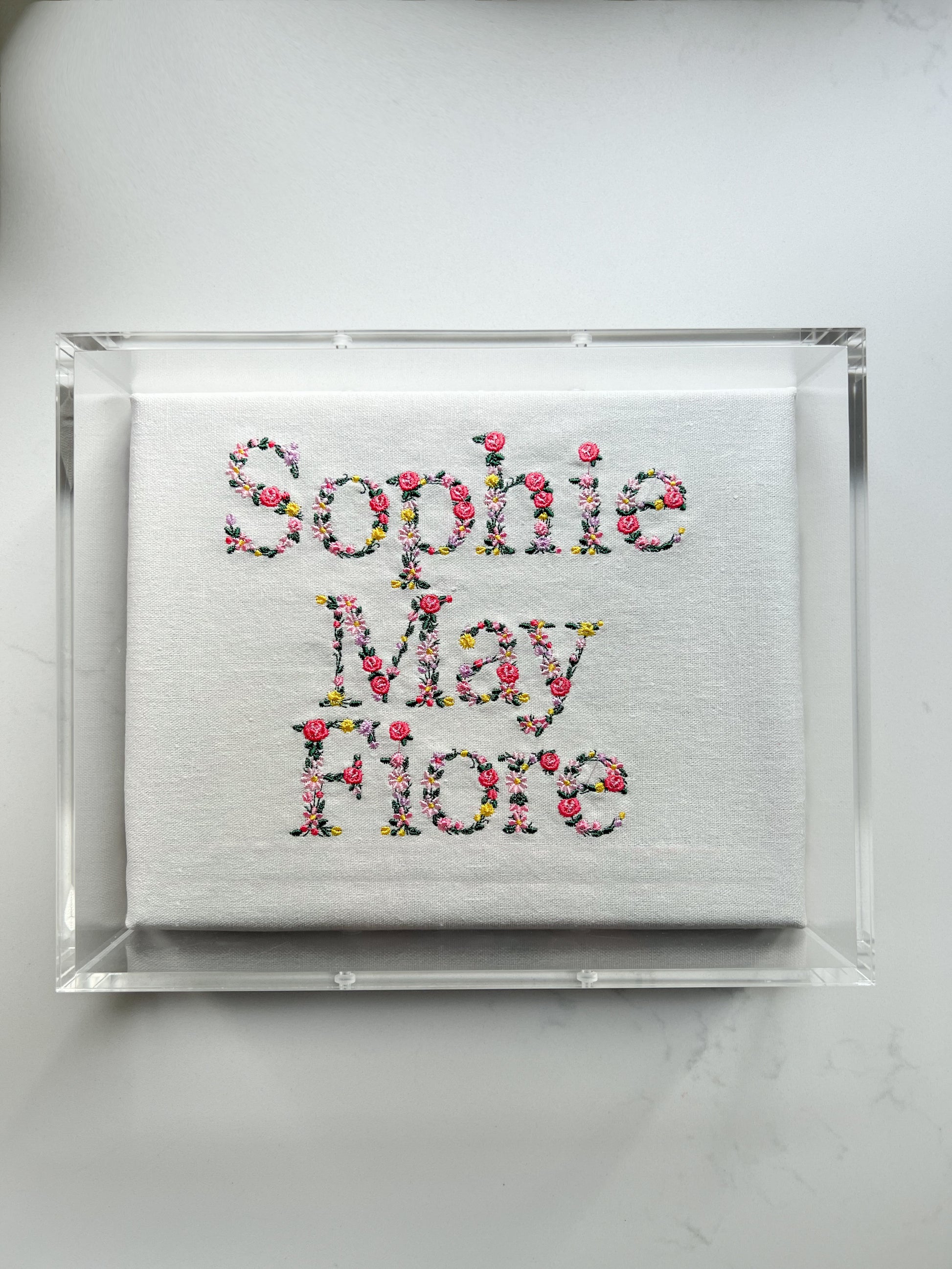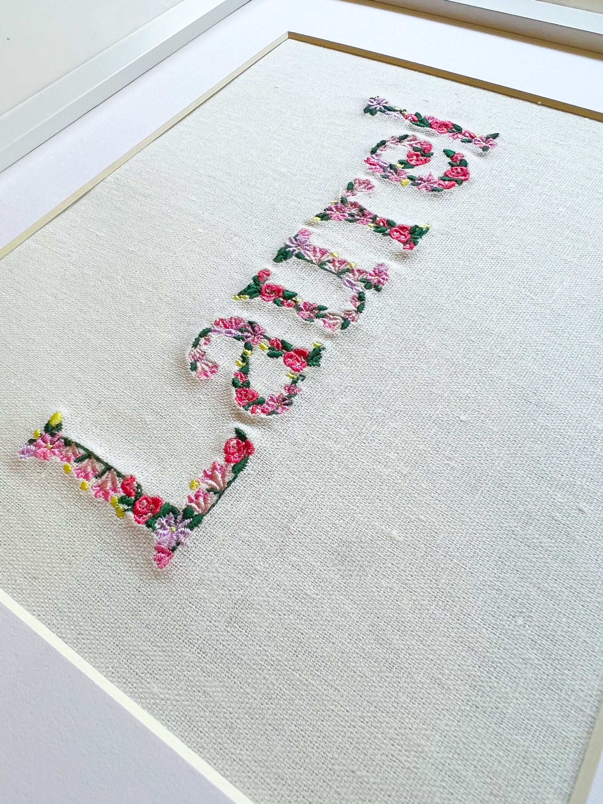 Embroidered on a linen/cotton fabric, this beautiful floral name is a timeless keepsake celebrating a little princess.