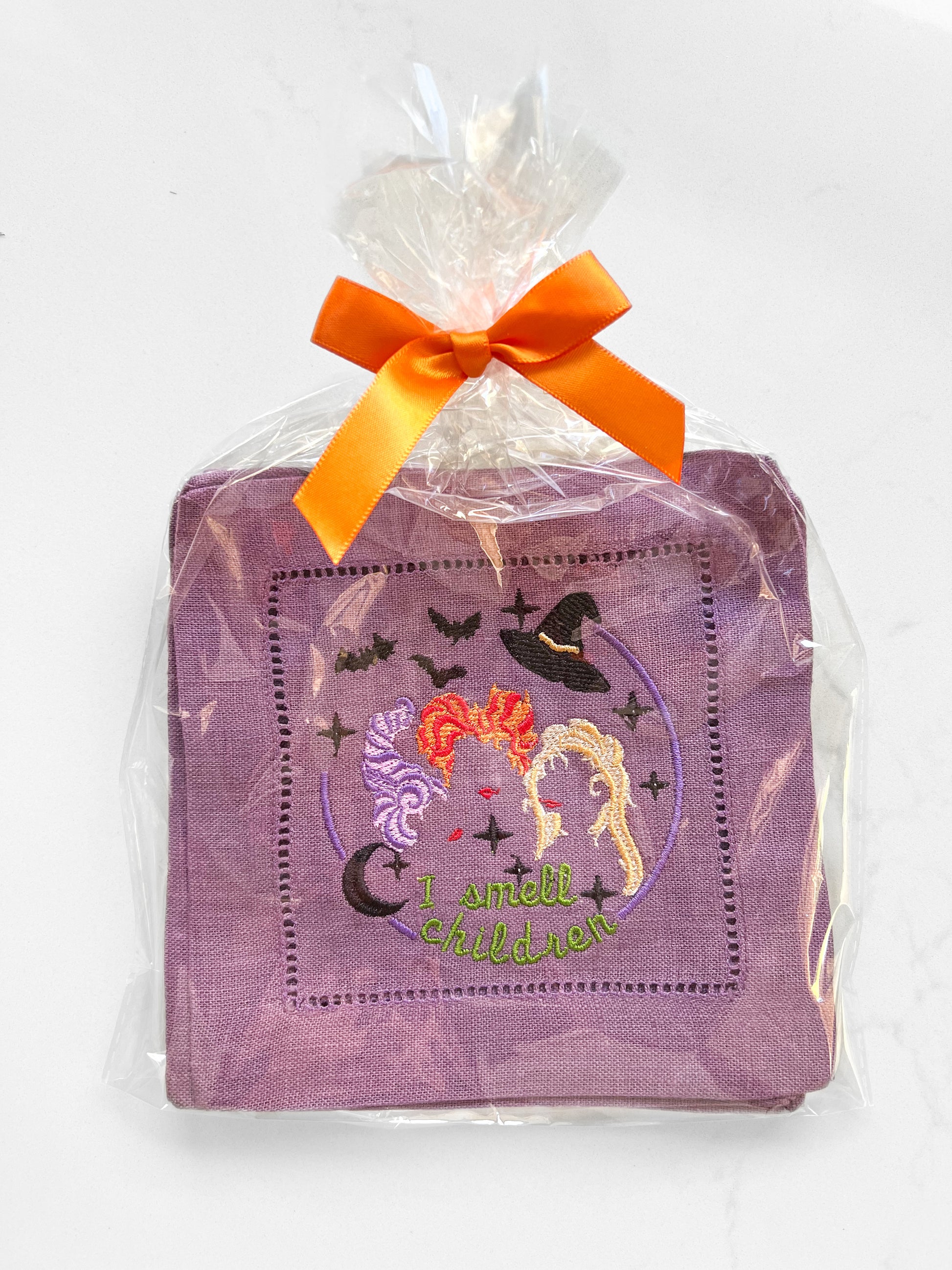 Dress your favorite beverage with our spooktacular cocktail napkins this Halloween. Offered as a set of 4, 6, and 8, these napkins are featured on a classic 100% linen hemstitch and measure 6x6.” Offered on both purple and white hemstitch. Napkins are luxury brand SFERRA.