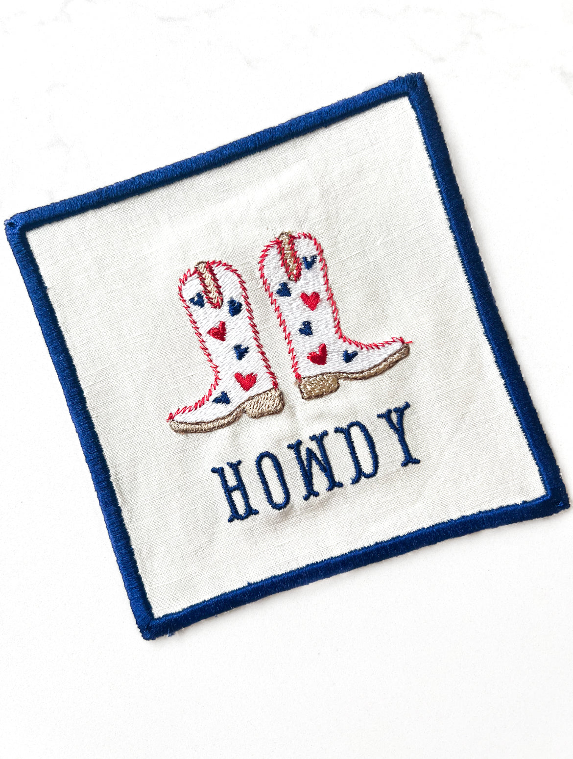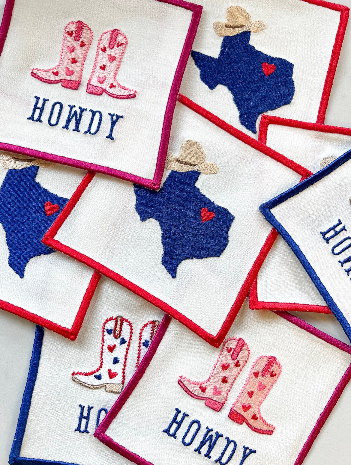 Beautiful linen curated into Howdy cocktail napkins. This set of 4 includes two boot napkins and two state napkins. Boots can be in red/white/blue or pink/red color combo, please specify below. State is shown as Texas, this can be customized as desired by client - please add this to details below.