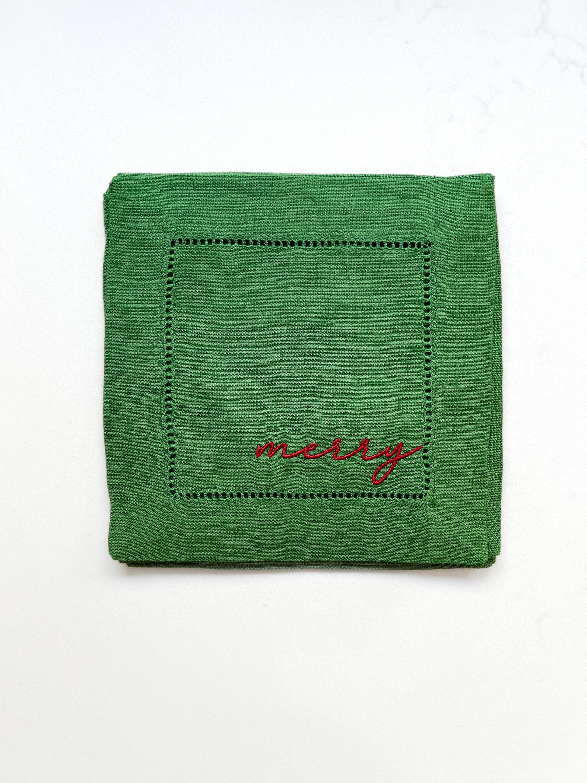 Dress your favorite holiday libation with our classic “merry” cocktail napkins this holiday season. Offered as a set of 4, 6, and 8, these napkins are featured on a classic 100% linen hemstitch and measure 6x6.” Napkins are luxury brand SFERRA.