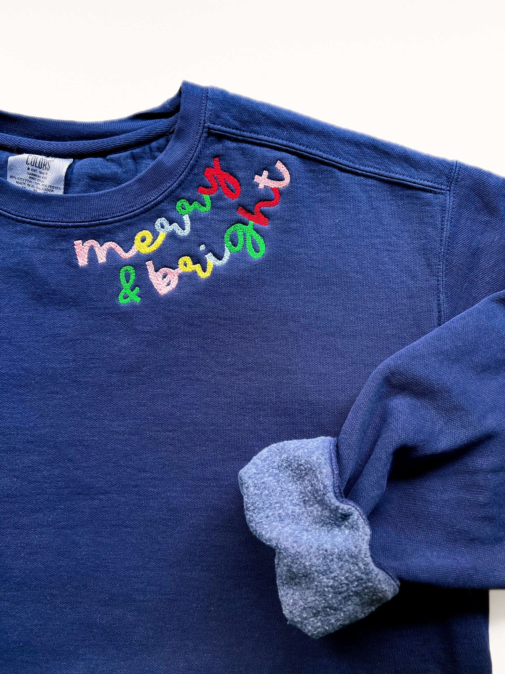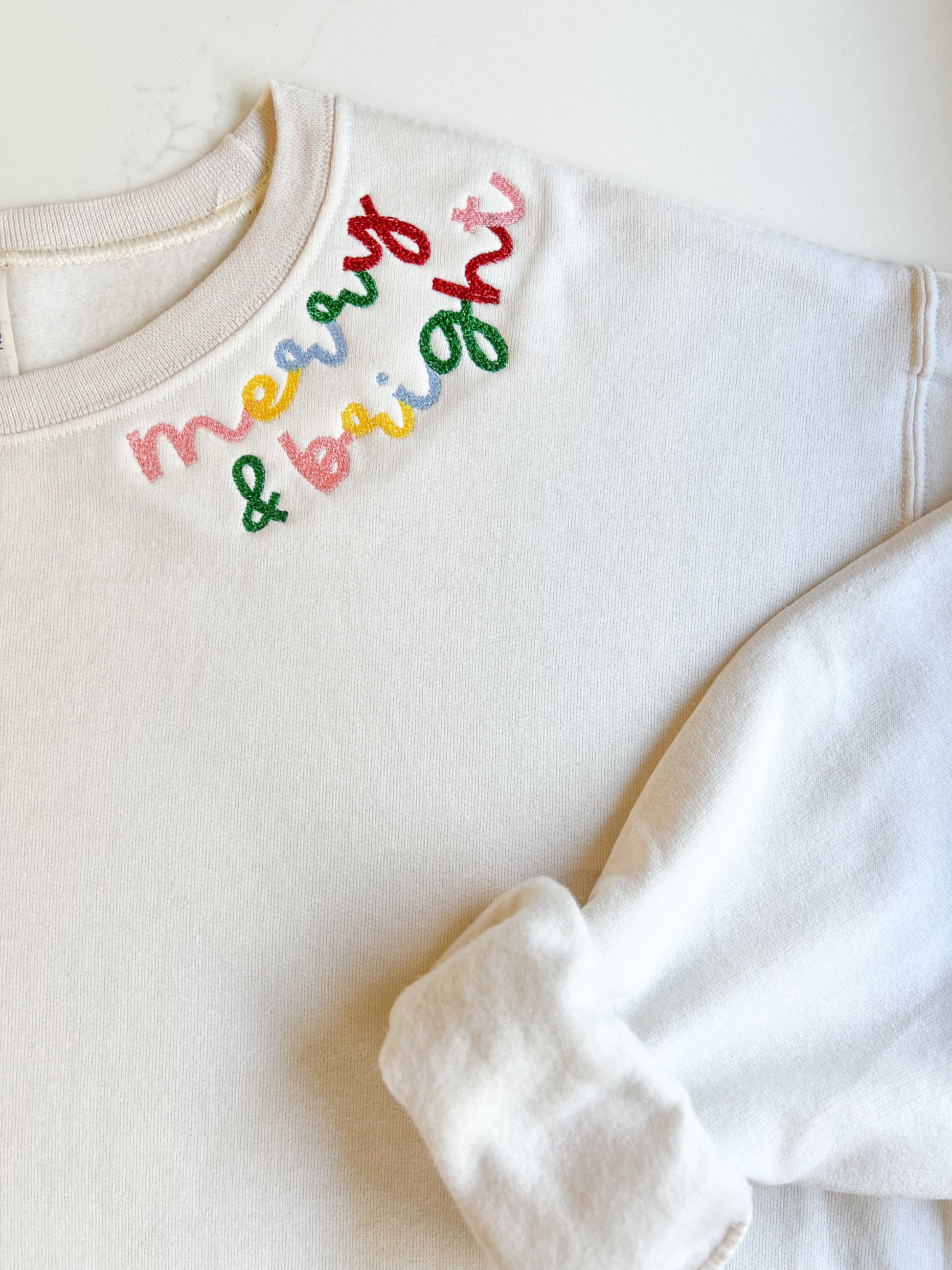 Product features “merry & bright” in multi colors as shown. Product is offered as a cream or navy sweatshirt, long sleeve shirt and short sleeve tee. Photos feature the sweatshirts. Brands offered for this product include but not limited to Comfort Colors, Independent Trading Co., and Jerzees. Brand provided by HST will be determined on client’s size, style, and product inventory.
