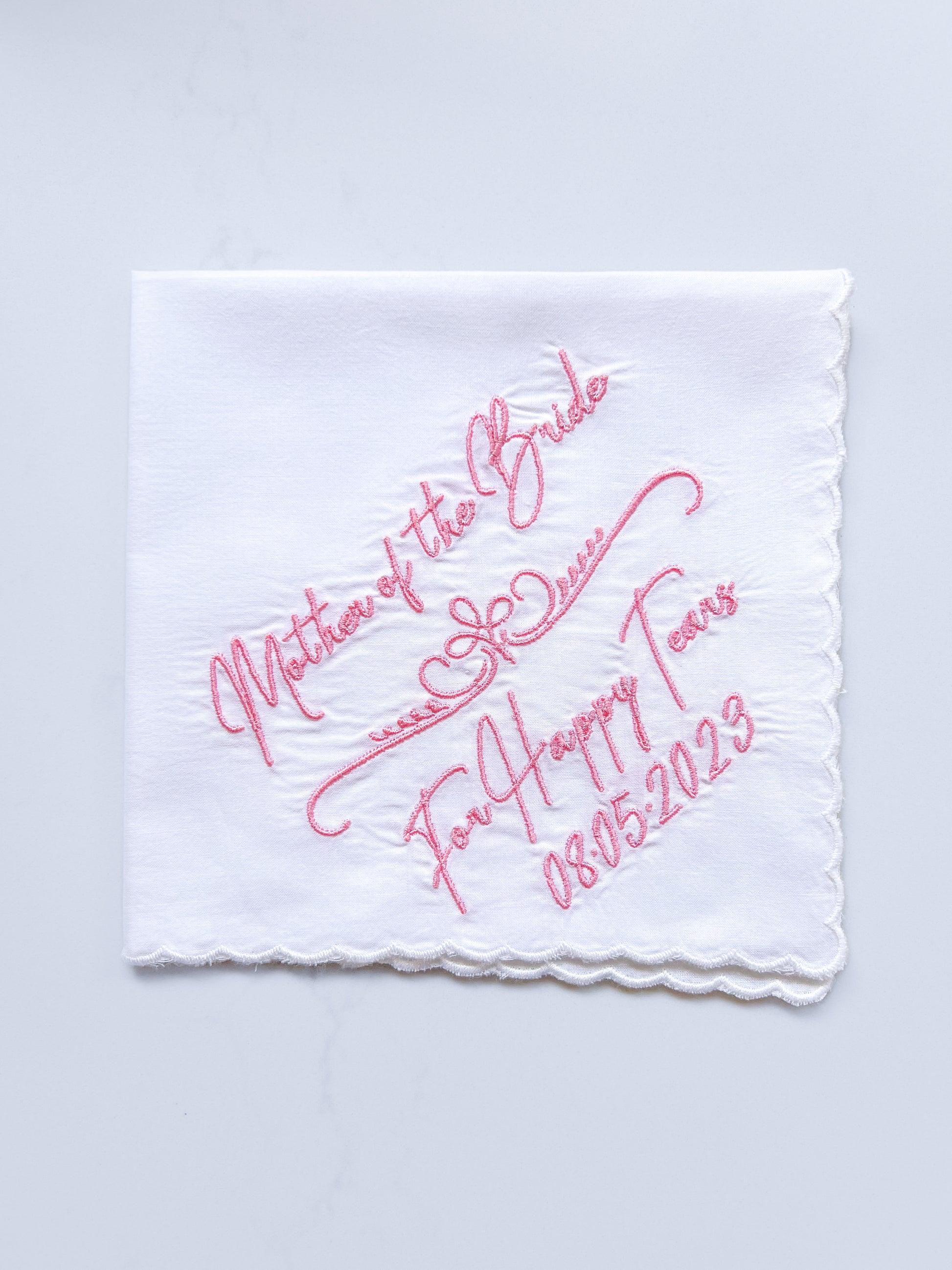 A thoughtful gift for the Mother of the Bride, this hanky features a scallop edge and reads “Mother of the Bride, for happy tears” and the wedding date.