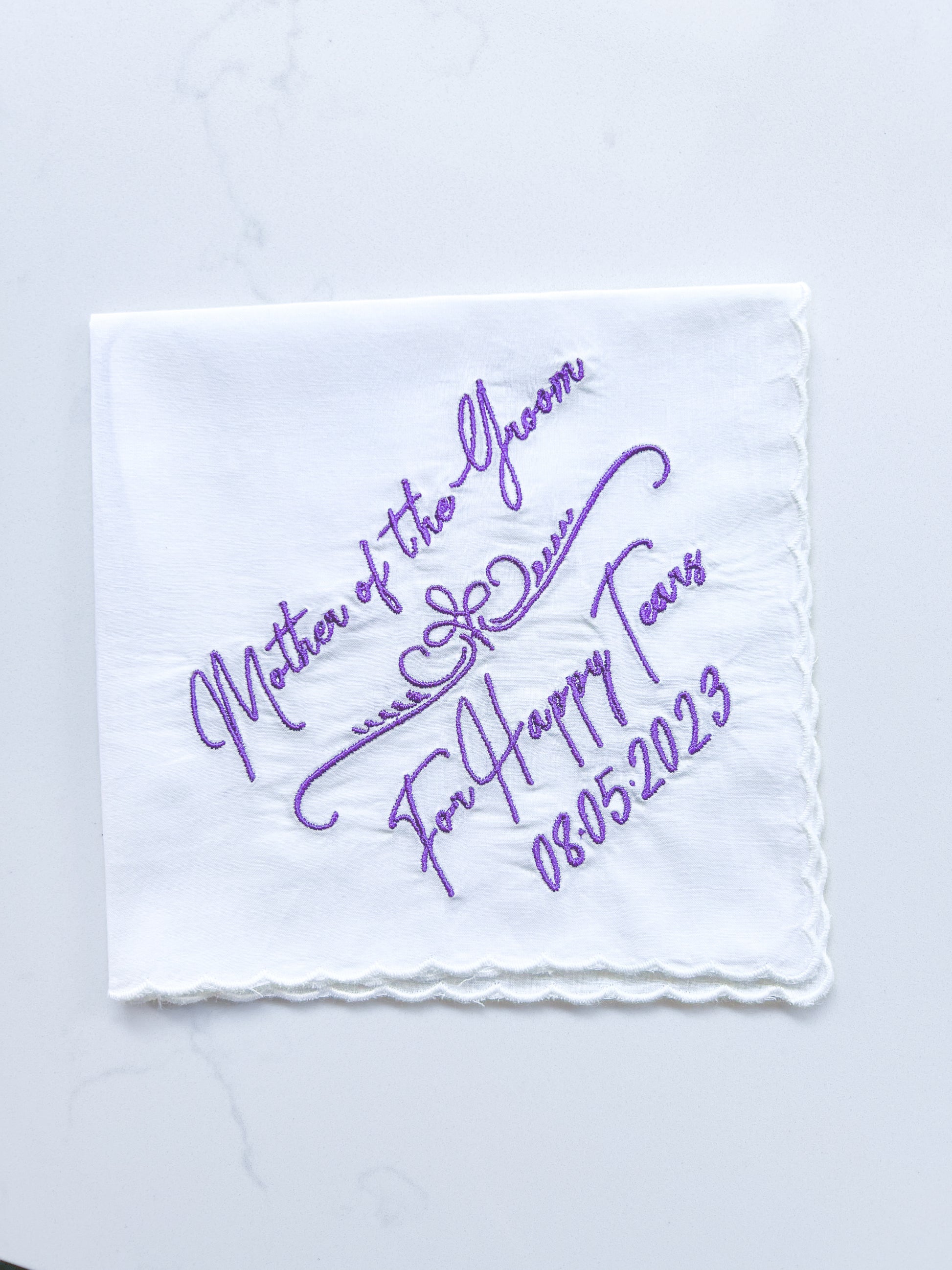 A thoughtful gift for the mother of the groom, this hanky features a scallop edge and reads “Mother of the Groom, for happy tears” and the wedding date.