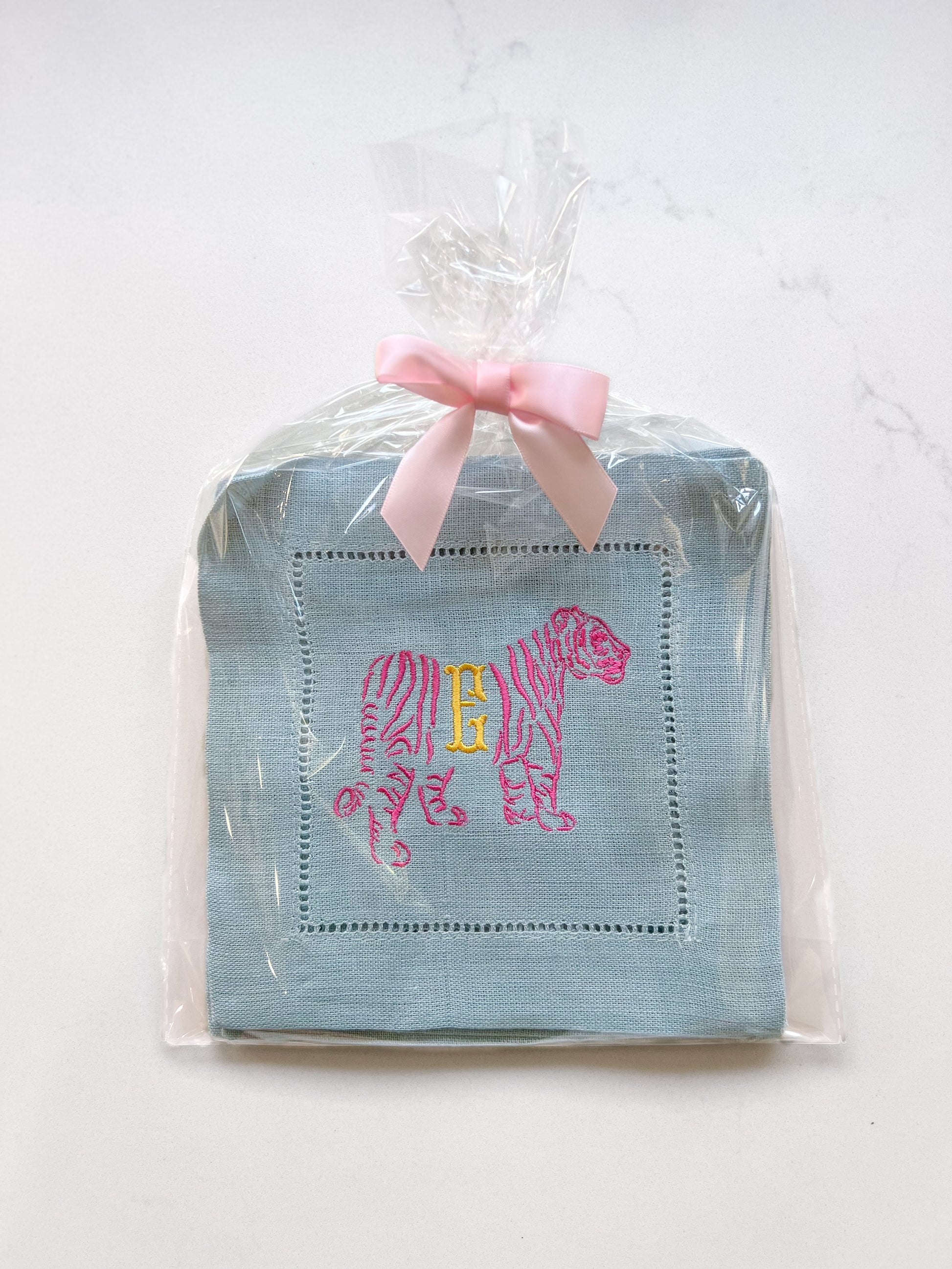 This set will be created in the colors shown unless otherwise specified by the client. White and cream napkins will maintain pink and yellow thread for the tiger and initial letter. If other colors are desired, please include them in the customization box below.