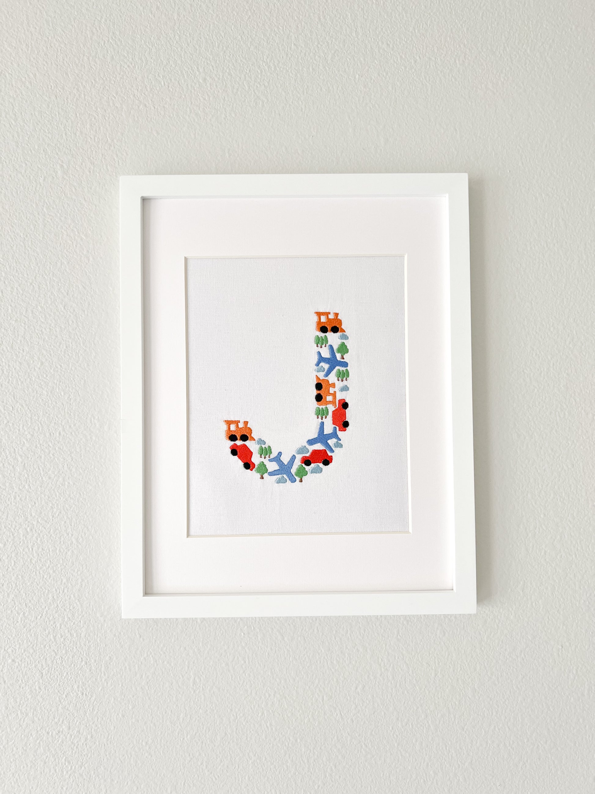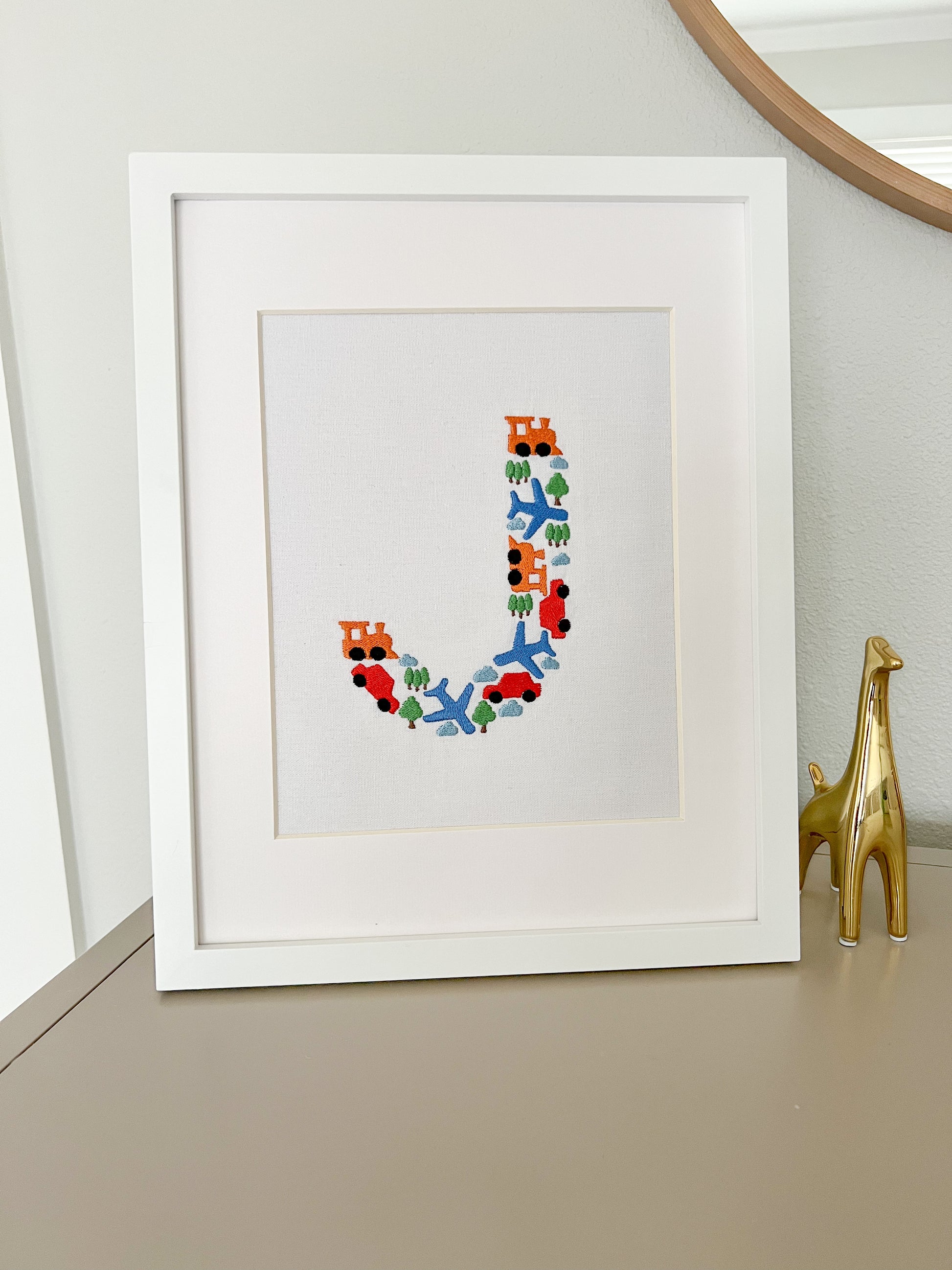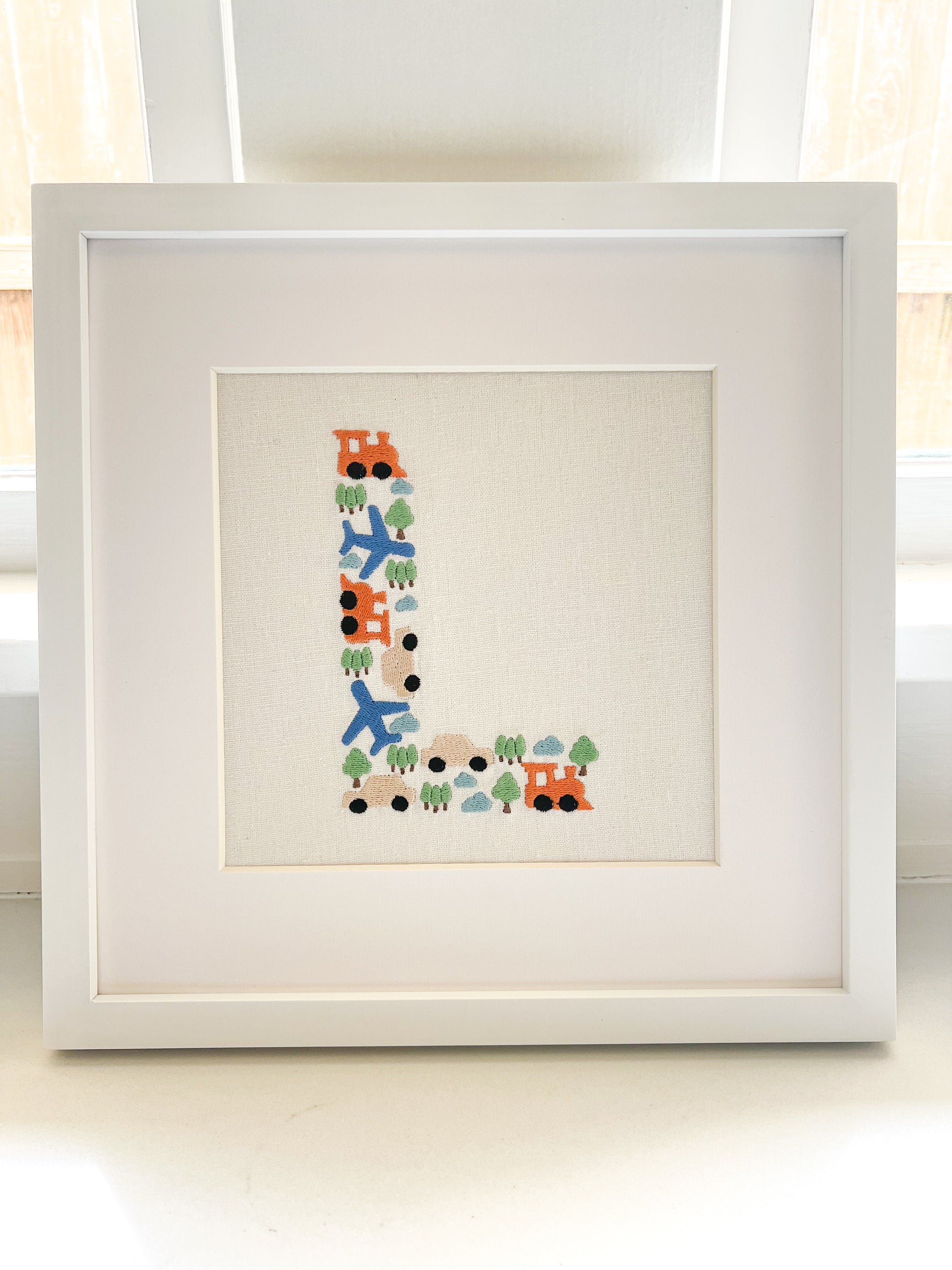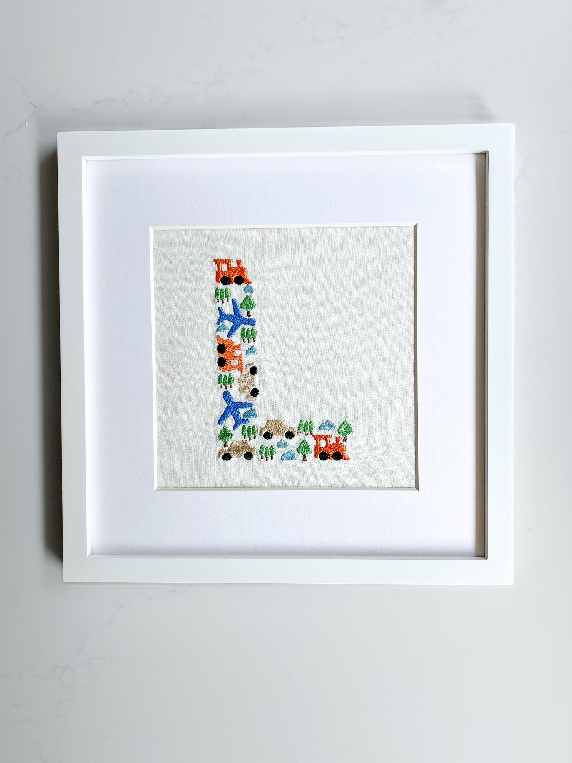 Embroidered on a linen/cotton fabric, the Transportation letter is a statement piece that celebrates someone special. The Trains & Cars letter is the perfect finishing touch to a nursery or little one’s bedroom. Perfect for both boys and girls as all colors are customizable. The piece can be framed as wall art or table top decor.