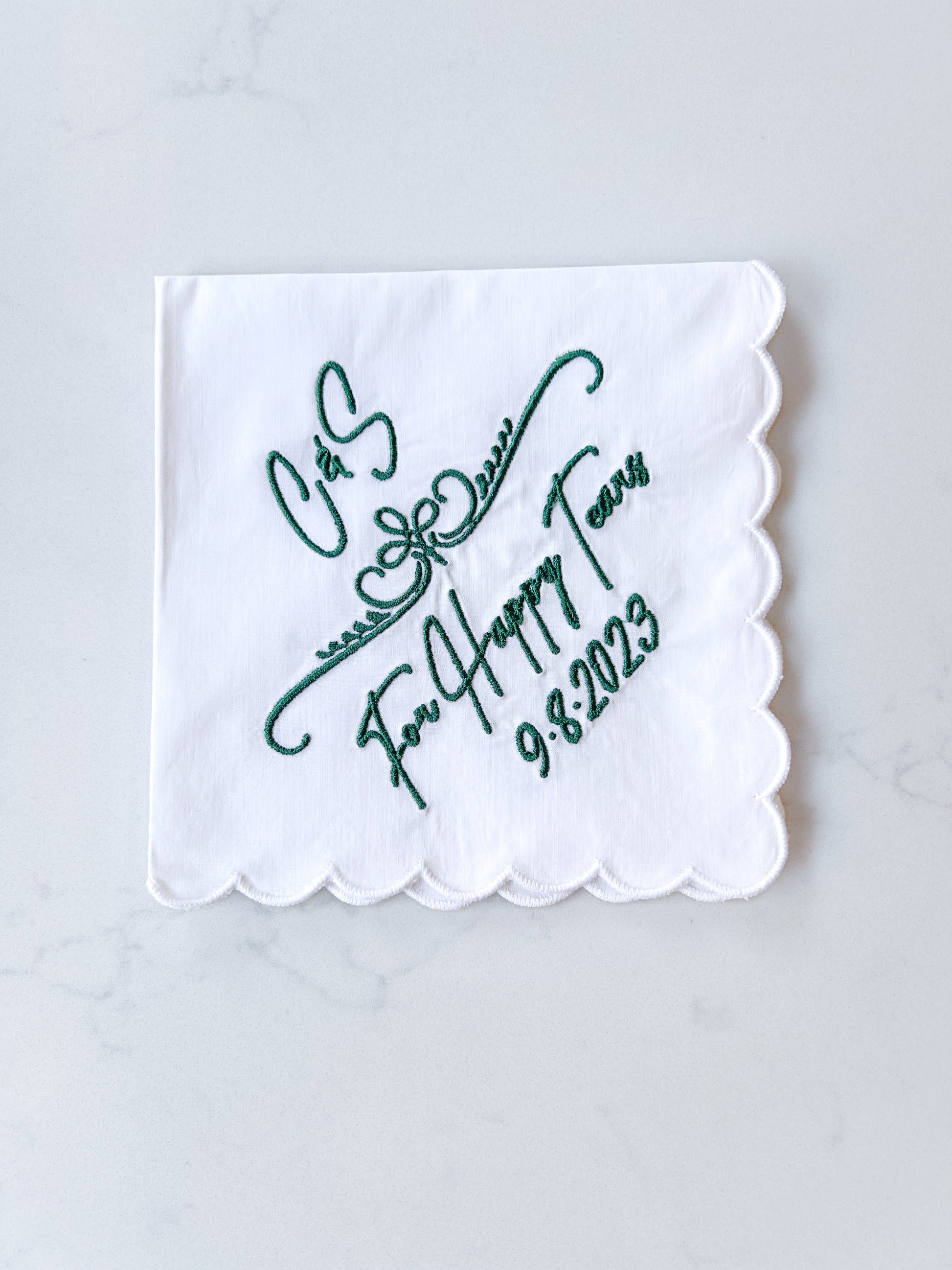 A thoughtful gift for the bride and groom, wedding party, and guests, this hanky features a scallop edge and is embroidered with the bride & groom’s initials, wedding date, and the inscription “for happy tears”