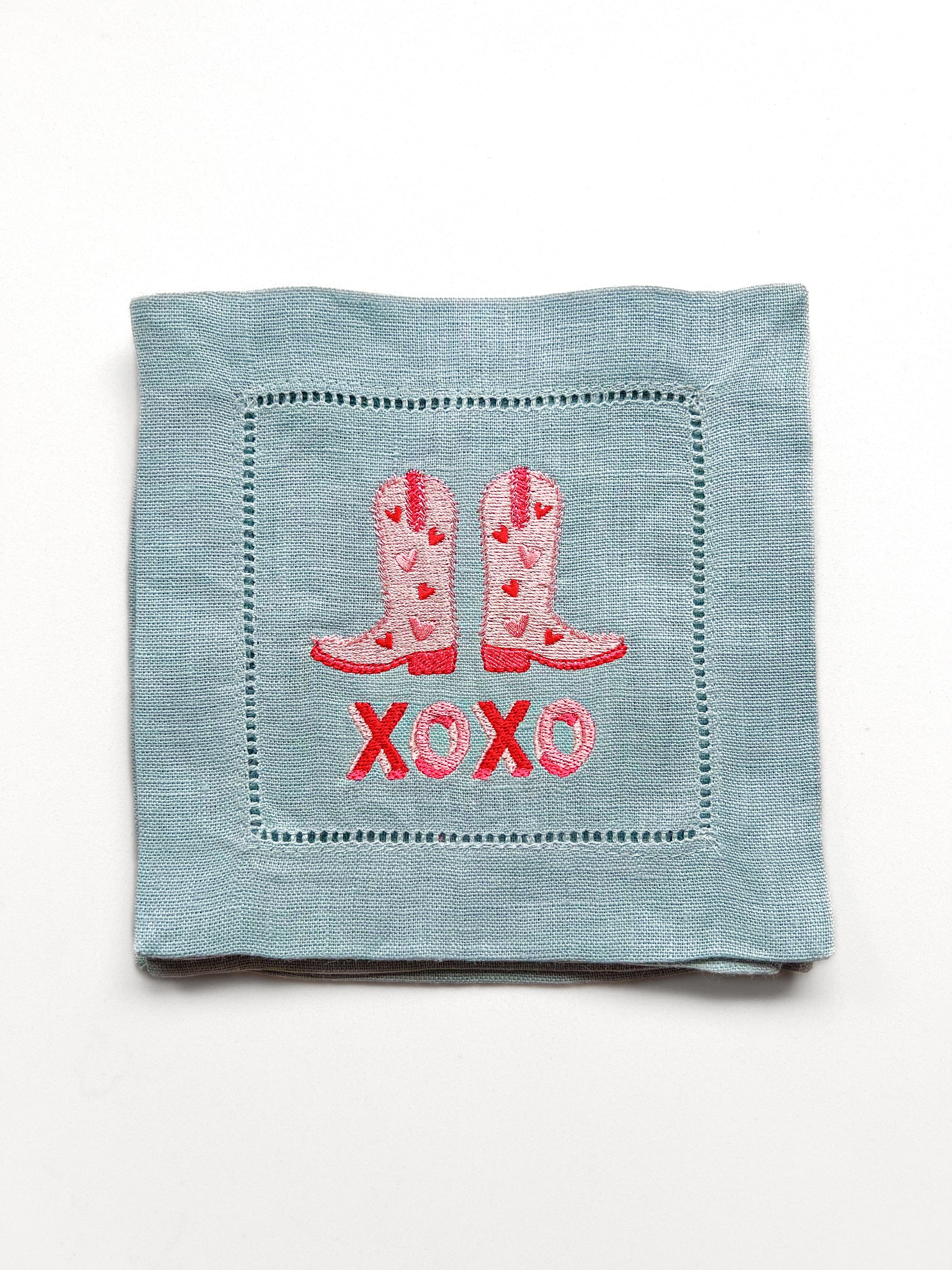 Introducing our exquisite set of 4 SFERRA luxury cocktail napkins, each measuring 6x6”. Elevate your entertaining experience this Valentine’s Day with these finely crafted napkins, adorned with embroidery featuring festive boots and “xoxo” in a charming script. The vibrant red and pink hues add a touch of fun and funk to any occasion, making these napkins a perfect blend of sophistication and charm to your festivities. Upgrade your cocktail hour or gift them to someone special for a delightful touch of luxury.